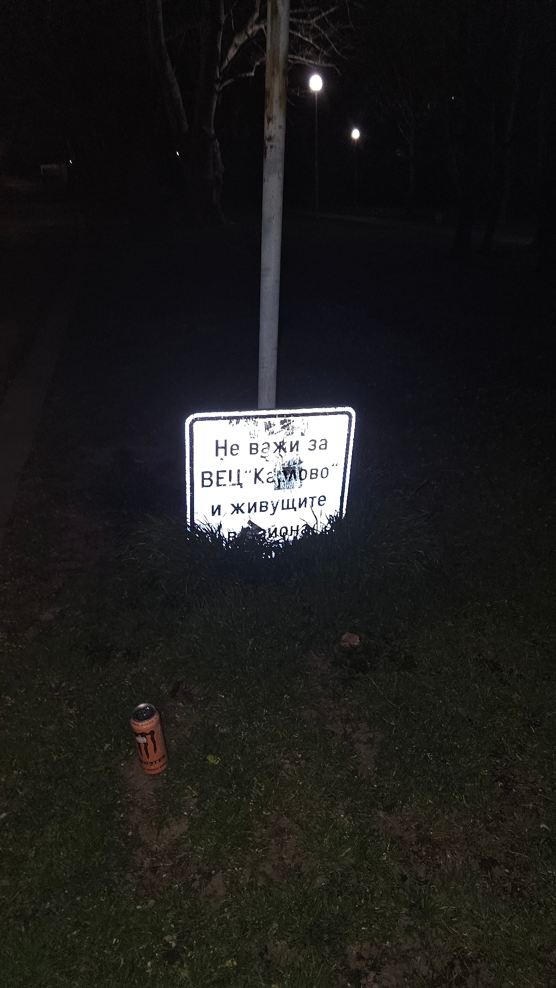 A nighttime image shows a sign in Bulgarian that reads, "Не важи за ВЕЦ ‘Карлово’ и живущите", attached to a post. To the right, a grassy area contains a discarded Monster energy drink can. The sign i…read more