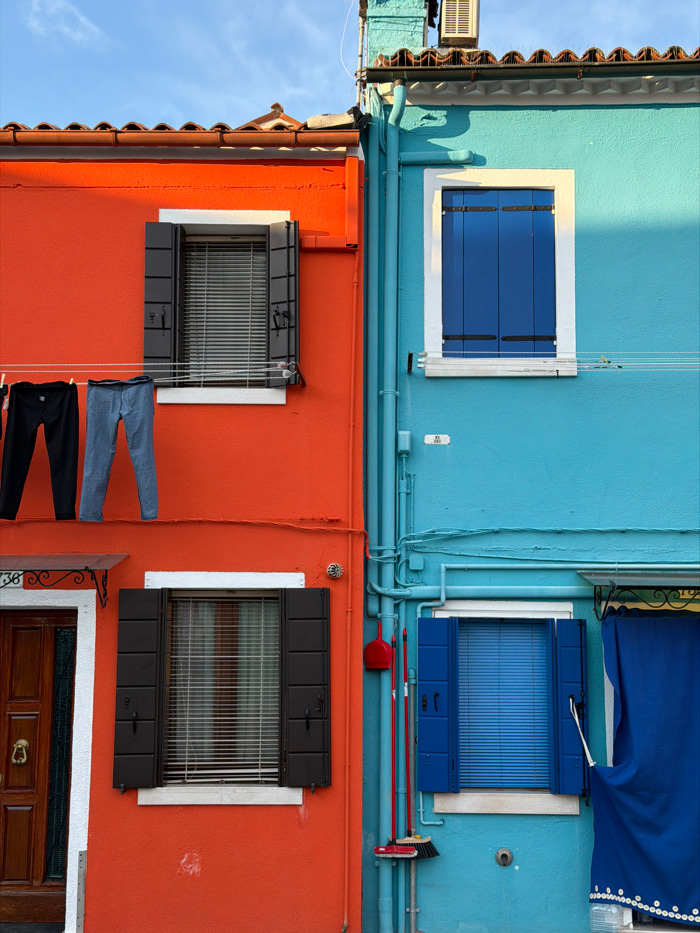 This image depicts the brightly colored facades of two adjacent residential buildings in Burano, Venice, Italy, under a clear blue sky. The building on the left is painted a vibrant orange. Its upper…read more