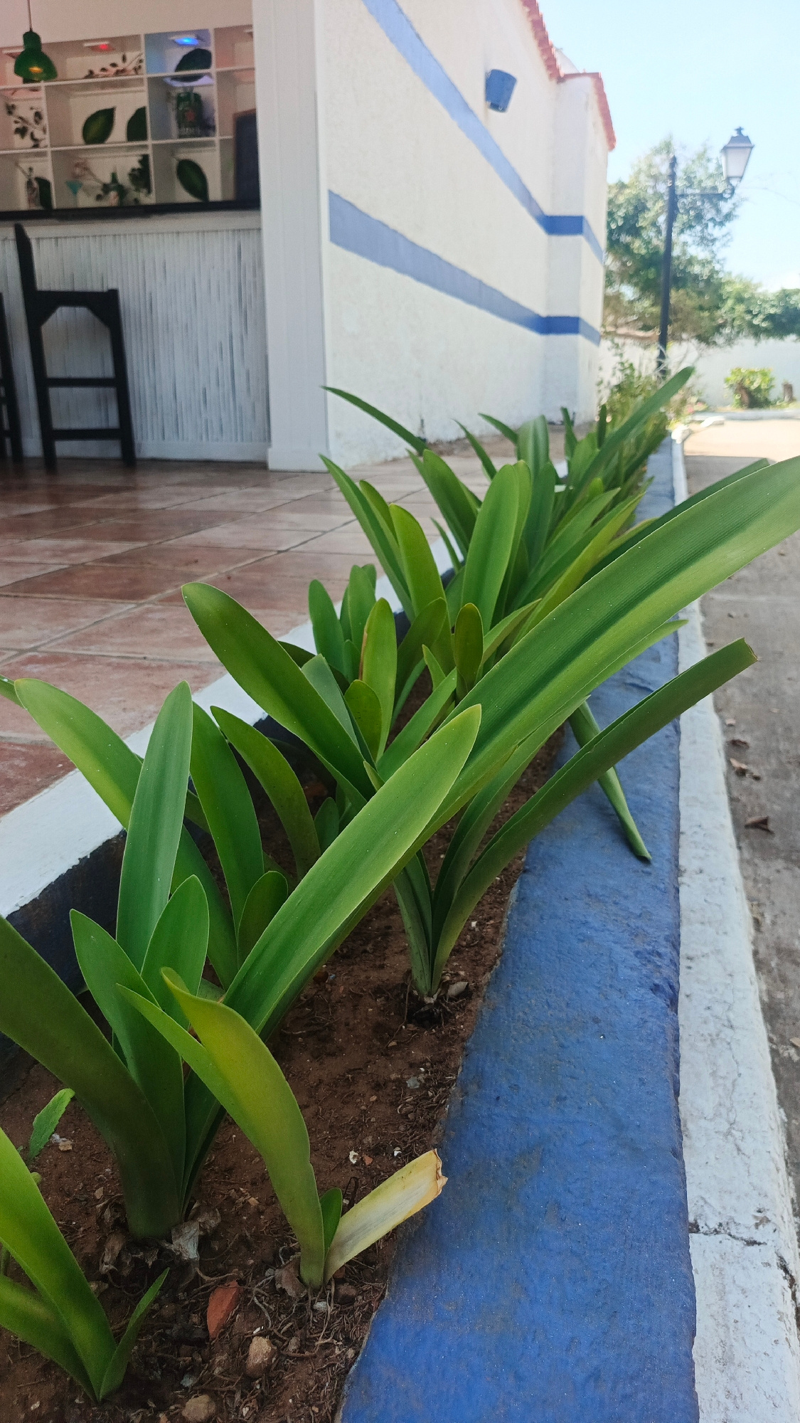 The image shows a row of green plants in a blue planter alongside a white building with blue stripes. A tiled patio is adjacent to the planter. In the background, there is a partially visible outdoor…read more