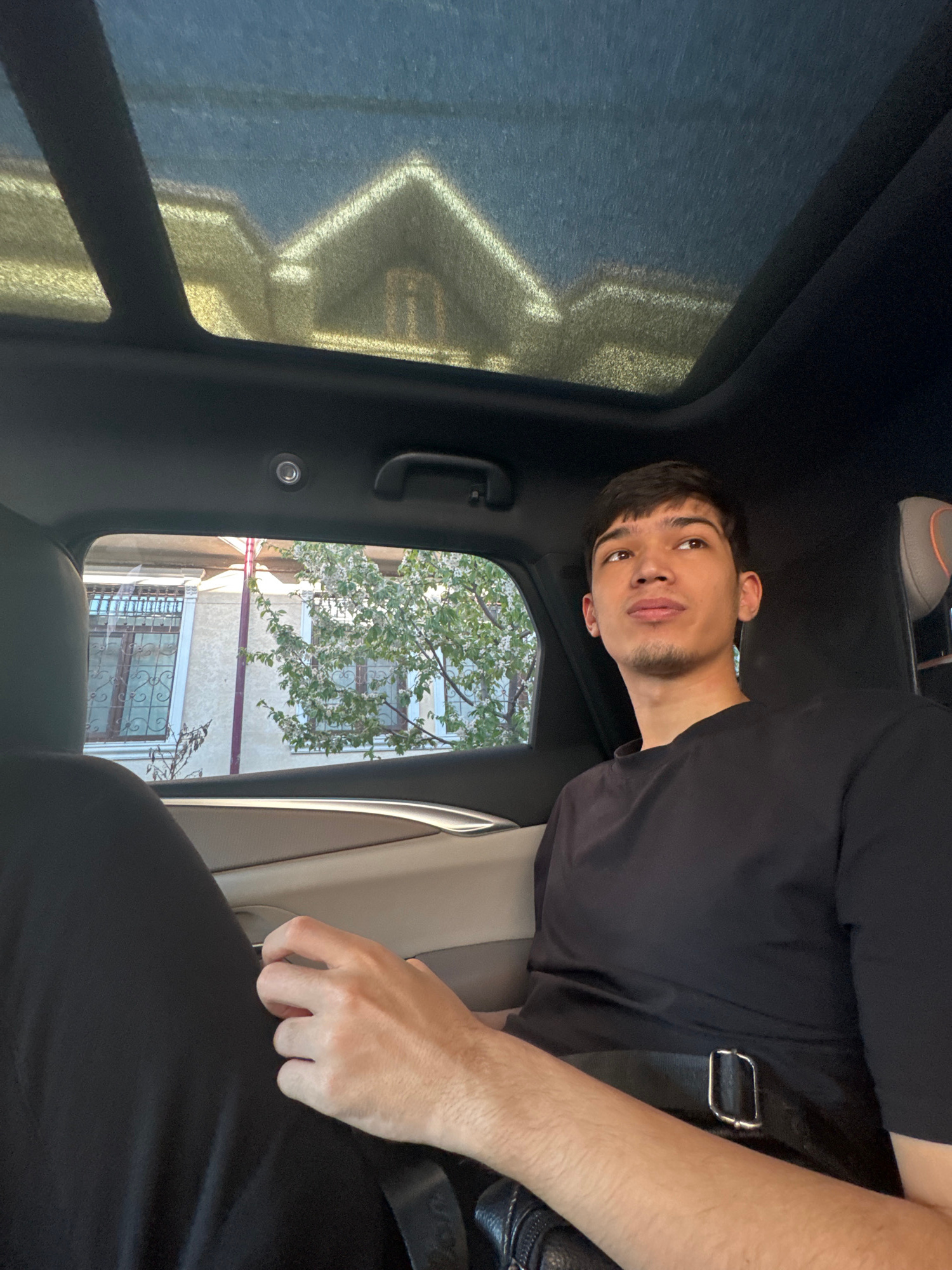 A young adult male with short dark hair, a trimmed beard, and light skin looks upwards towards the camera. He is seated inside a car, wearing a black t-shirt and a shoulder bag with a black strap. Out…read more