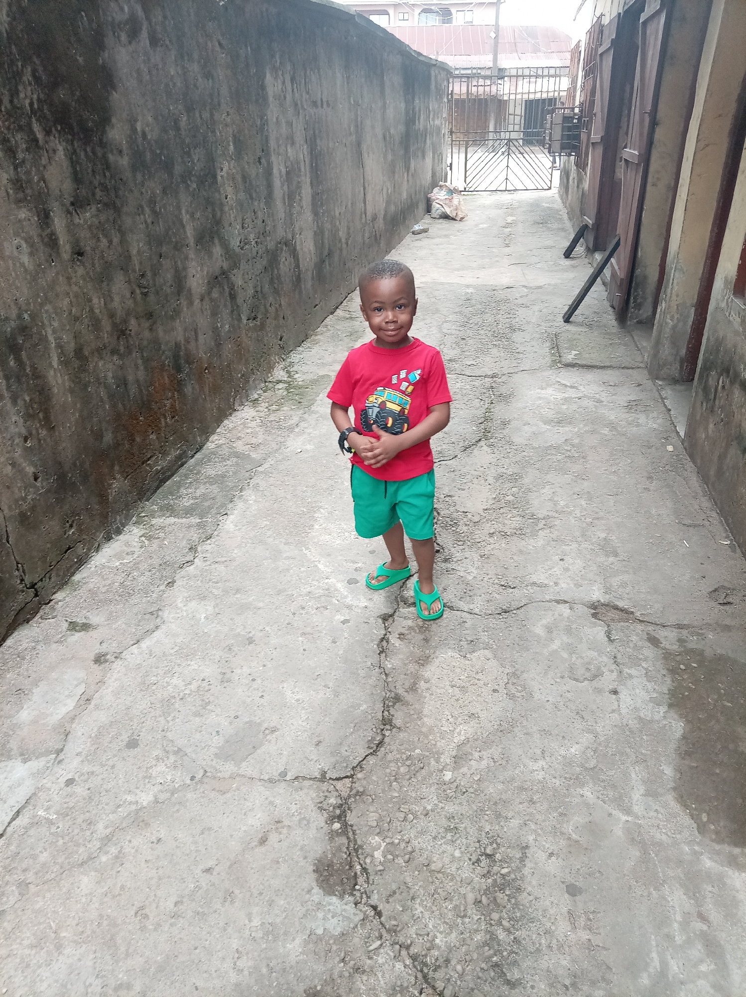 A young boy stands in the middle of a narrow concrete alleyway in Owerri, Nigeria. He is wearing a red t-shirt with a graphic design, green shorts, and green sandals. He has a watch on his left wrist…read more