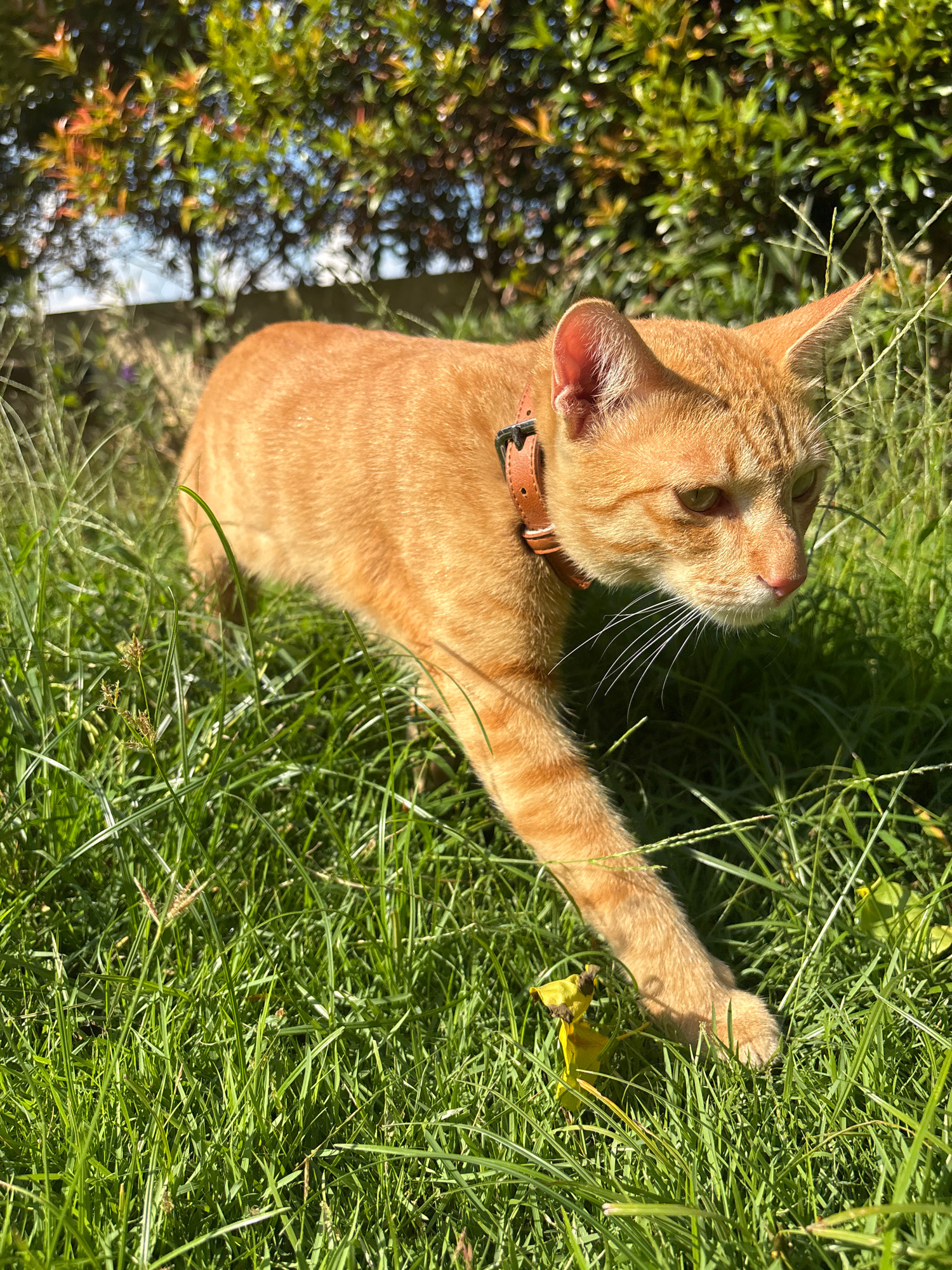 An orange tabby cat with a brown collar is sitting in a grassy area. The cat is looking upwards and reaching out with its right front paw, possibly towards the grass. The background includes foliage,…read more