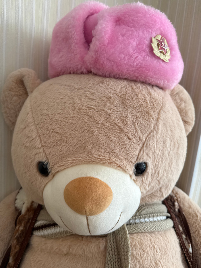 The image displays a close-up of a light brown plush teddy bear located indoors in Makiivka, Ukraine. The bear's head and upper torso are central, featuring small black eyes, a cream-colored muzzle, a…read more