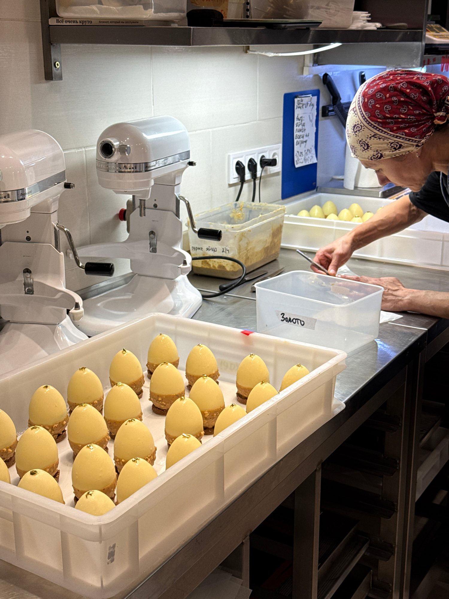 The image shows an indoor kitchen environment, possibly a professional bakery or pastry shop, in Belgrade, Serbia. A person wearing a red and white patterned headscarf is focused on a task involving a…read more