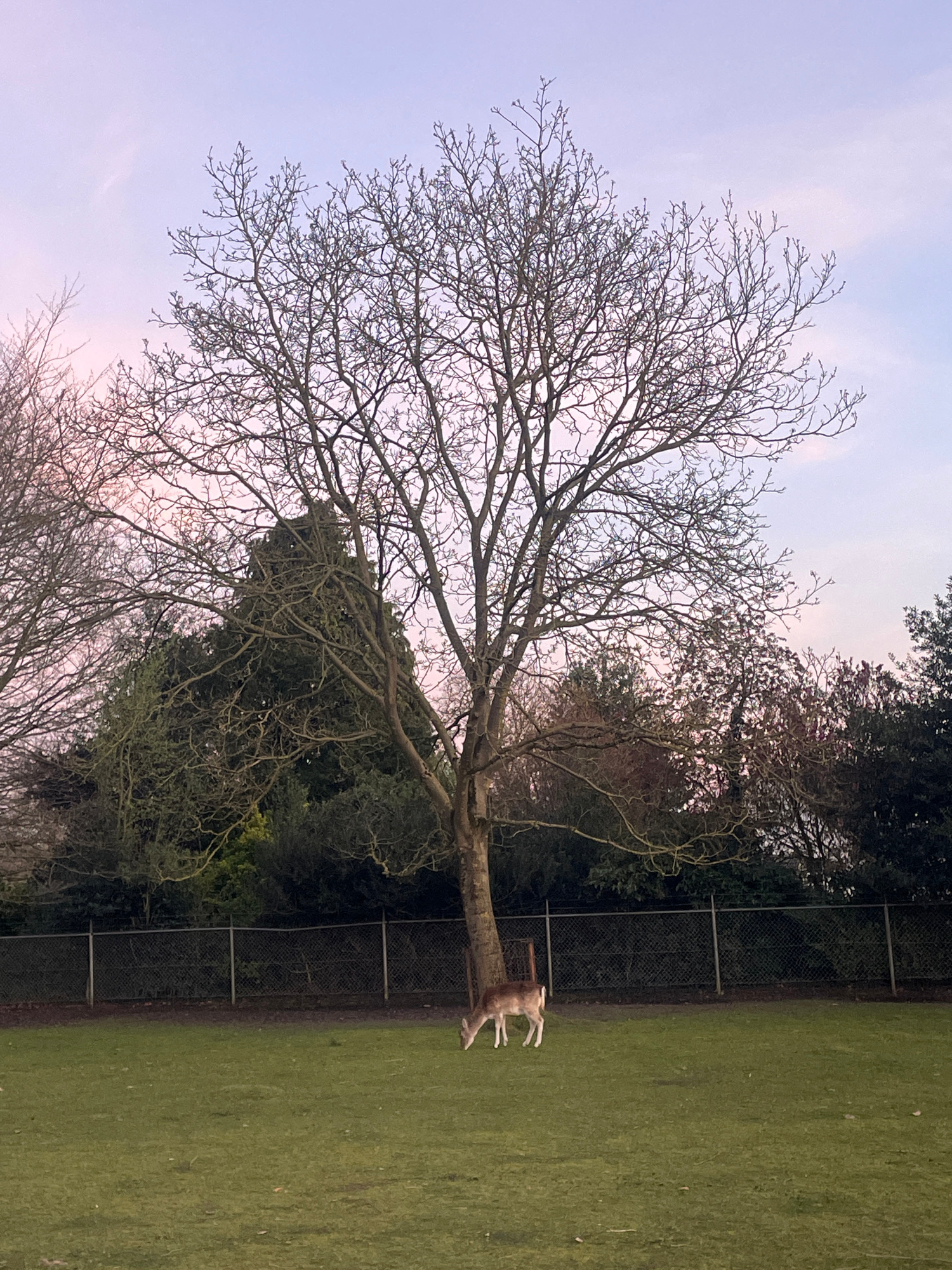 A landscape scene reveals a large, leafless tree dominating the left side of the frame against a pale sky. Its branches extend upwards and to the right. Behind the tree are darker green trees and foli…read more