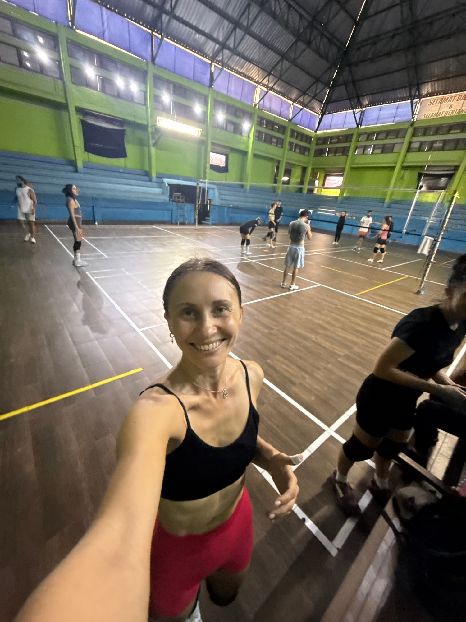 The image depicts an indoor volleyball court in Peliatan, Indonesia, populated by a group of individuals. The focal point is a woman taking a selfie, wearing a black sports bra and red shorts, smiling…read more