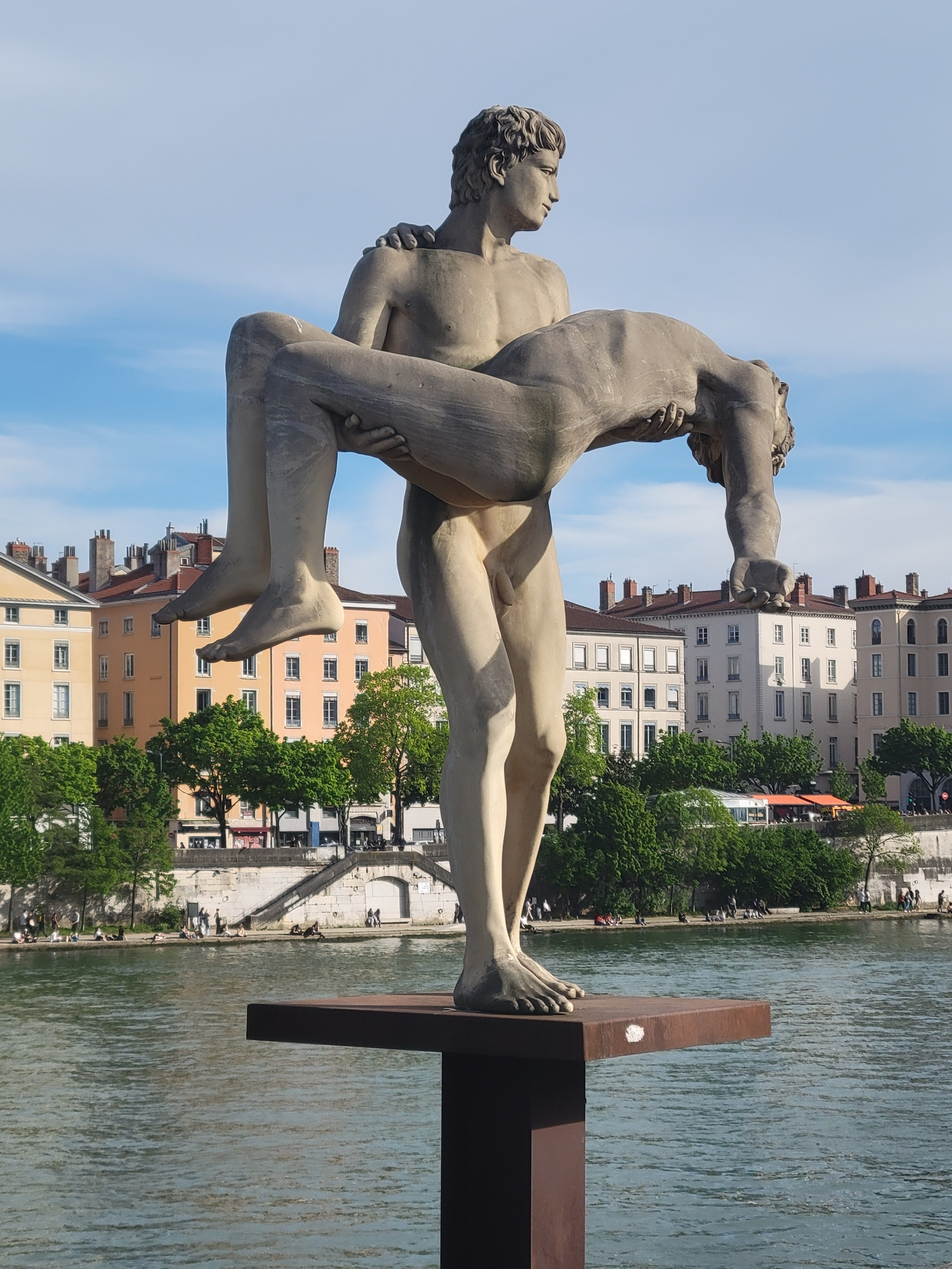 The image shows the statue of "L'Homme de la Roche" in Lyon, France, situated on the Saône river. It depicts a muscular man holding another figure over his head. The statue is mounted on a metal struc…read more