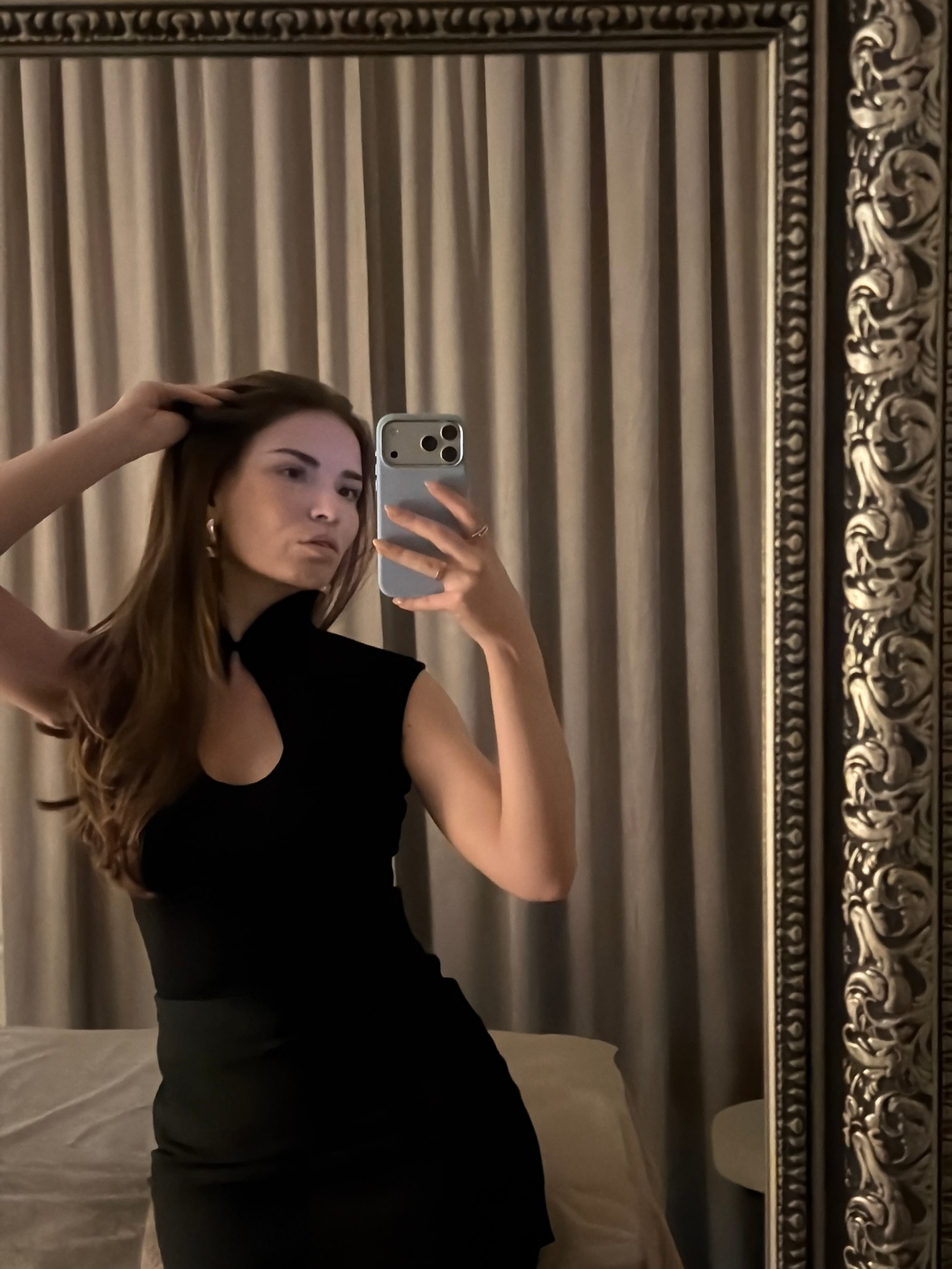 The image displays a young woman taking a mirror selfie indoors in Moscow, Russia. The woman is reflected in a large mirror featuring an ornate, silver or gold-colored frame, prominently visible acros…read more