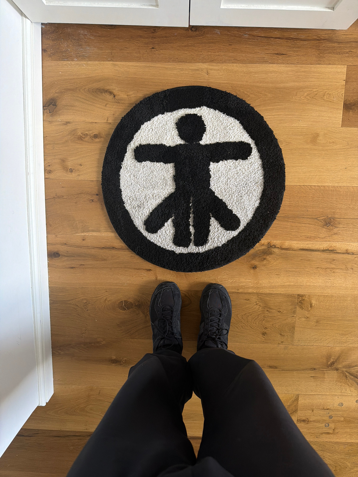The image shows a section of a room with light brown wooden flooring. In the center-left of the frame lies a circular rug with a black border. The rug features a white background with a black figure resembling a stylized human form within the circle. To the right of the rug, a pair of black athletic shoes and black pants are visible, suggesting someone is standing near the rug. A partial view of a white door frame is seen on the left side of the image. The lighting appears to be natural and even. No information in the picture suggests a location in the city of London, United Kingdom. | Open Wire