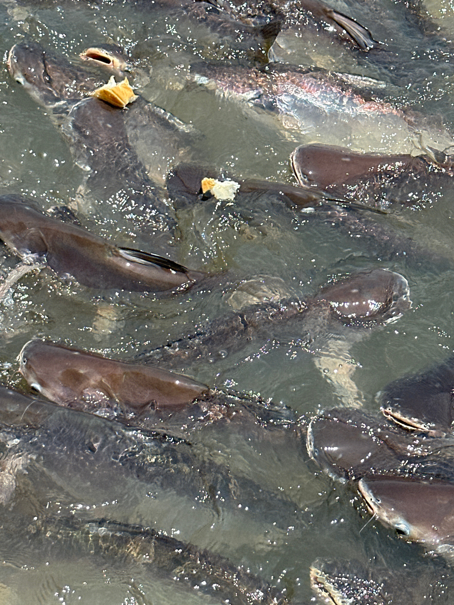 The image shows a group of Pangasius catfish in murky water, likely in the city of Bang Kruai Town Municipality, Thailand, given the prompt's context. Many fish are visible, with some displaying their…read more