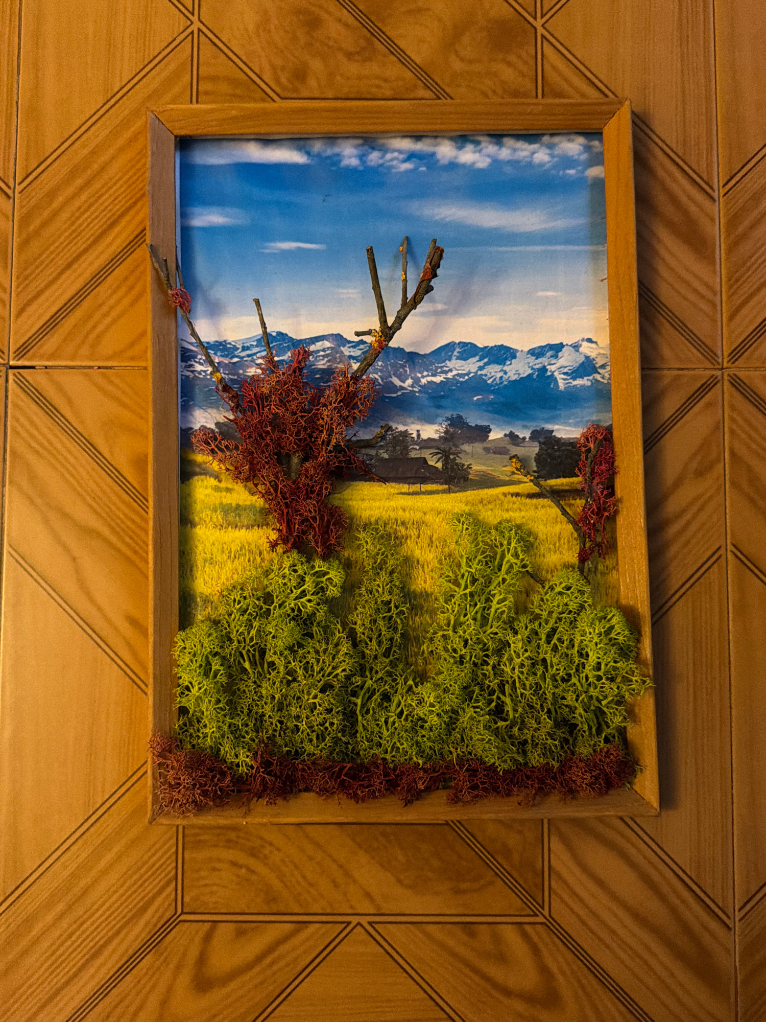 A framed three-dimensional nature diorama is depicted, located in the city of Pleven, Bulgaria. The rectangular artwork is presented in a light brown wooden frame with mitered corners. The background…read more