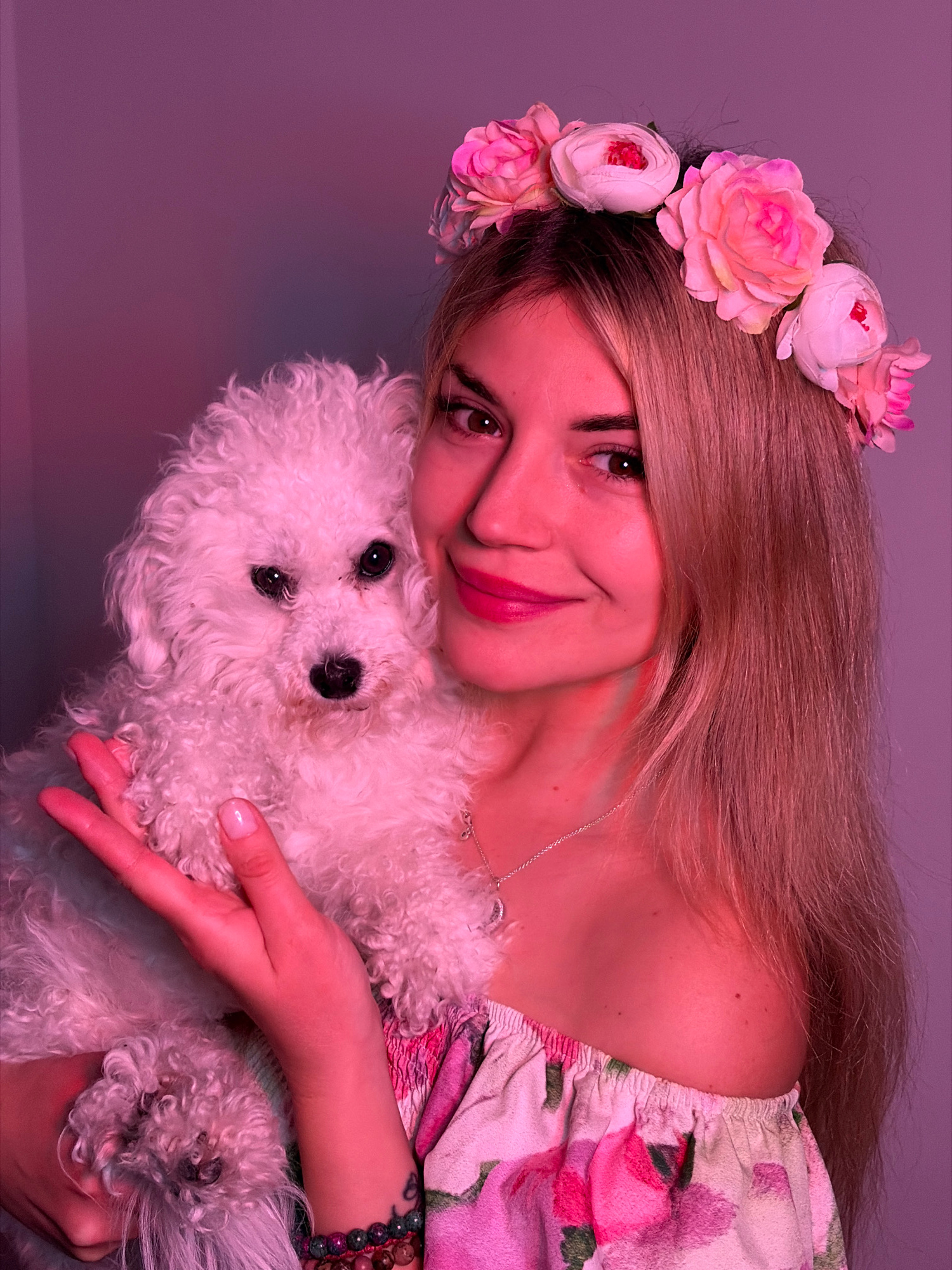 A young woman with long blonde hair wearing a floral headband and a floral-patterned top is hugging a small white dog. The woman is smiling. The background is a gradient of light purple to darker purp…read more