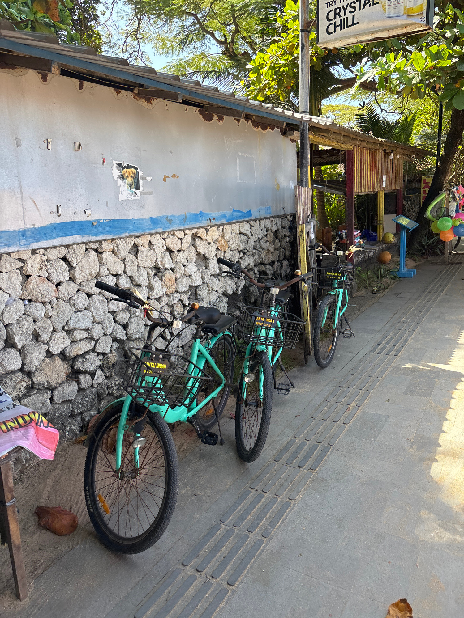The image shows a street scene in Denpasar, Indonesia. Three light-green bicycles with black baskets are parked against a low stone wall, bordered by a faded building on one side and a tiled sidewalk…read more