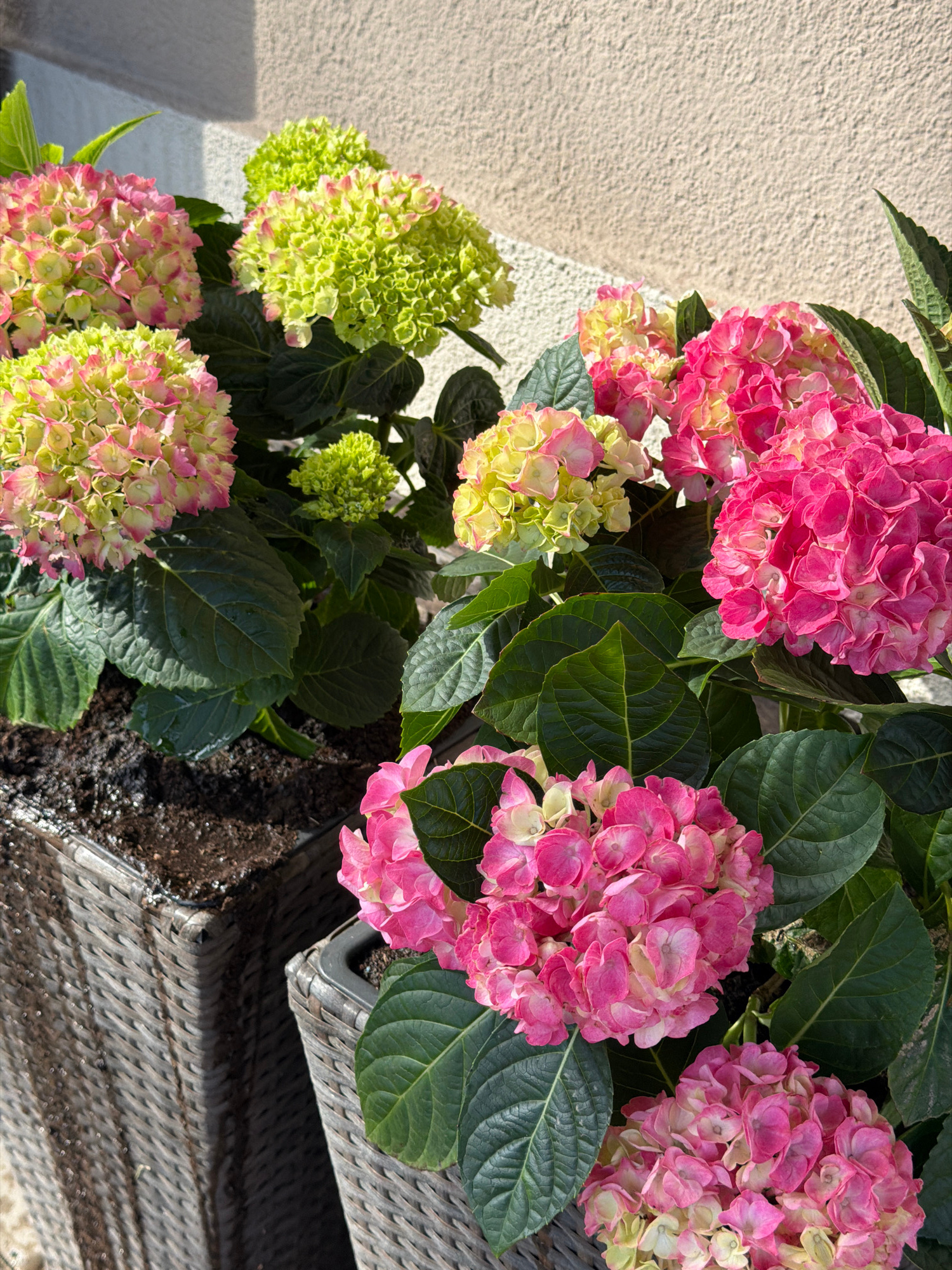 A high-angle shot captures a planter brimming with hydrangeas, exhibiting a range of colors from deep pink to pale green. The flowers are set against a backdrop of large, dark green leaves. The plante…read more
