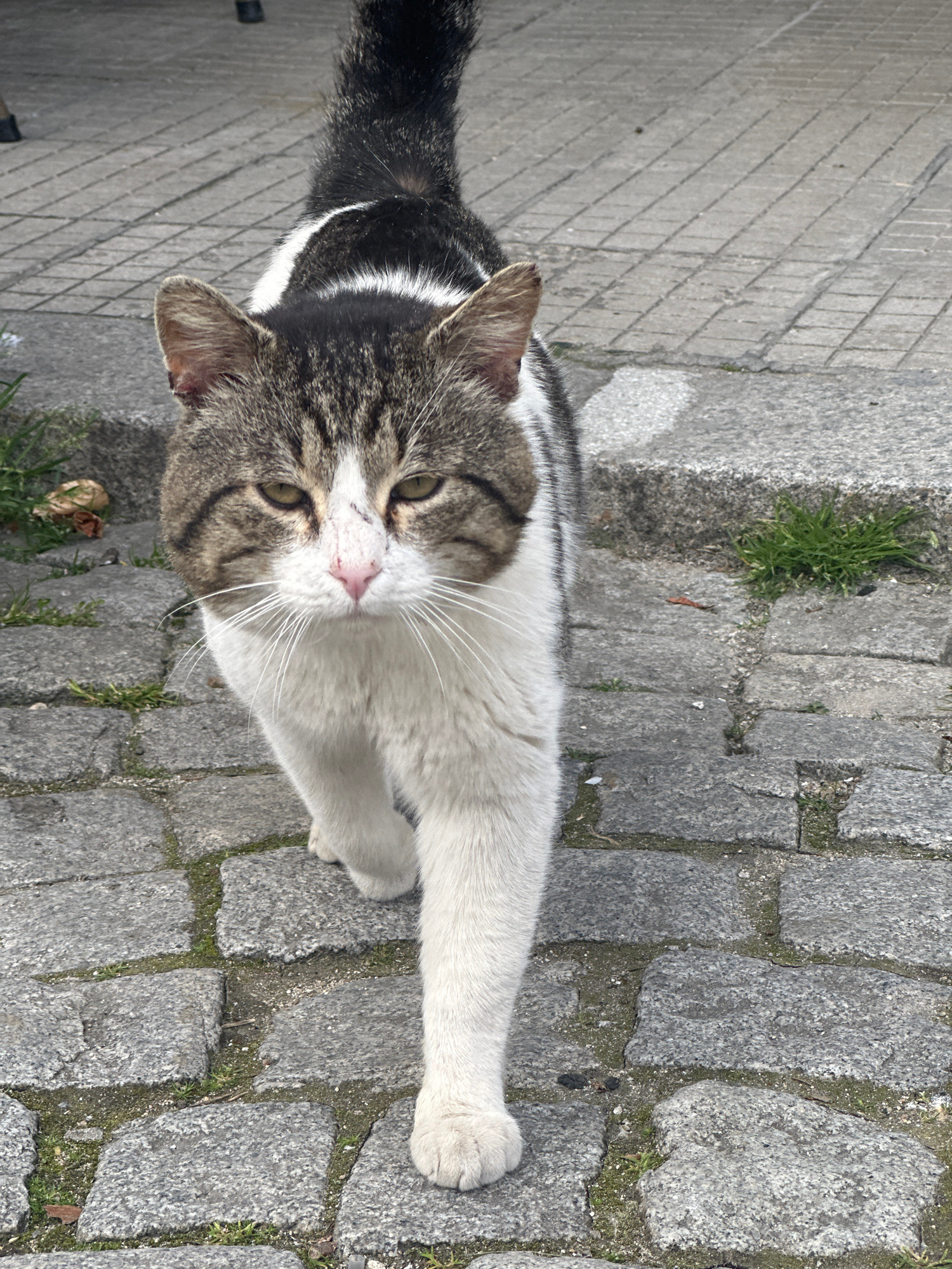 A close-up, slightly angled overhead shot depicts a cat on a paved surface composed of gray stones. The cat has a white body with gray tabby markings on its head and a black tail with white stripes. I…read more