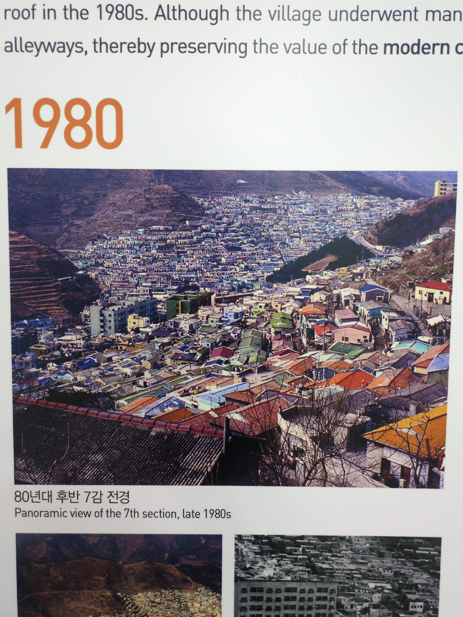 The image shows a panoramic view of a neighborhood in Busan, South Korea, circa 1980. Buildings with colorful roofs are densely packed together, nestled on a hillside. To the left is a steep, mountain…read more