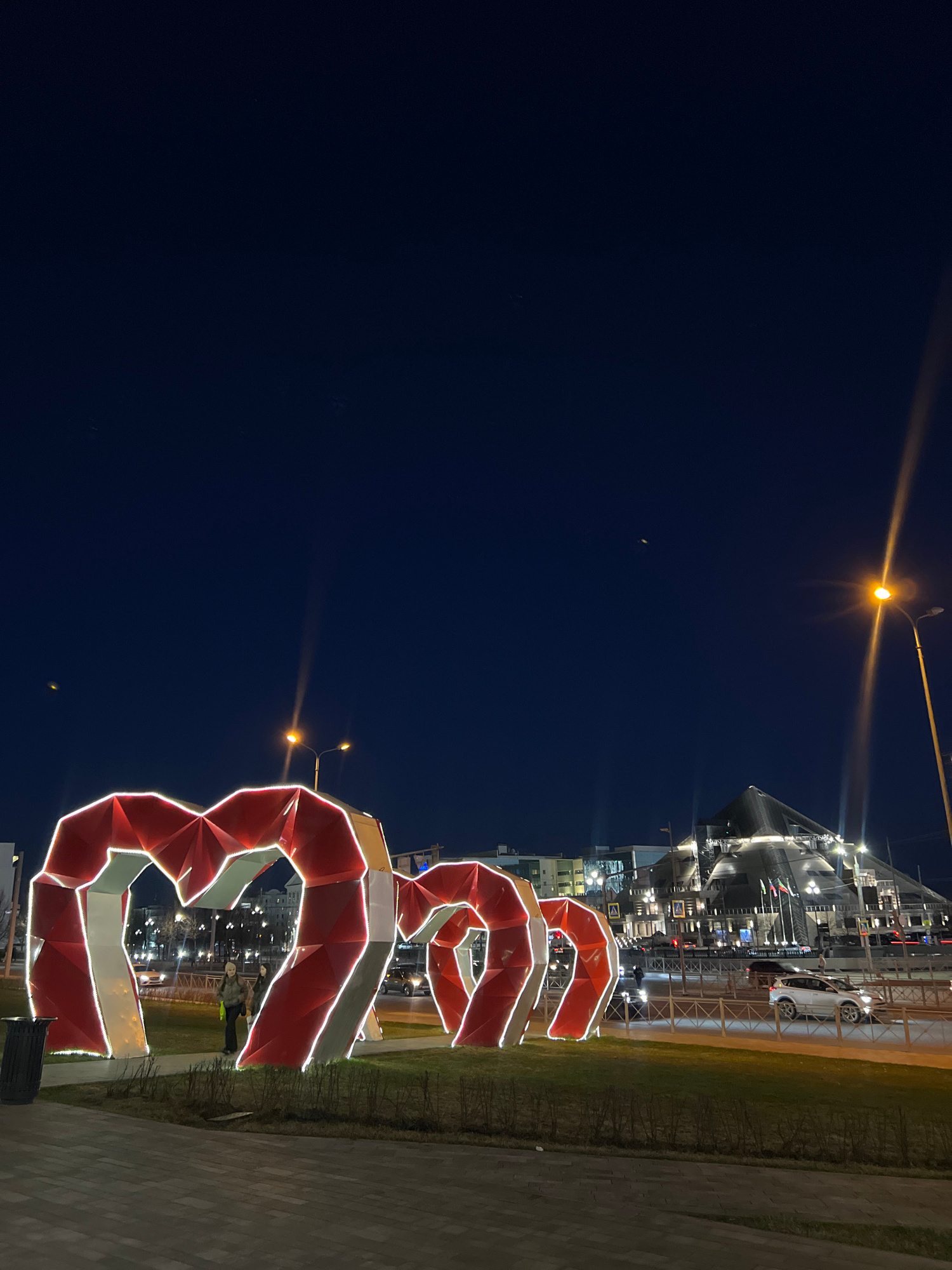 The image captures a nighttime scene in Kazan, Russia. A large, illuminated sculpture resembling a ribbon is prominently displayed on a paved area alongside a patch of grass. The sculpture is red and…read more