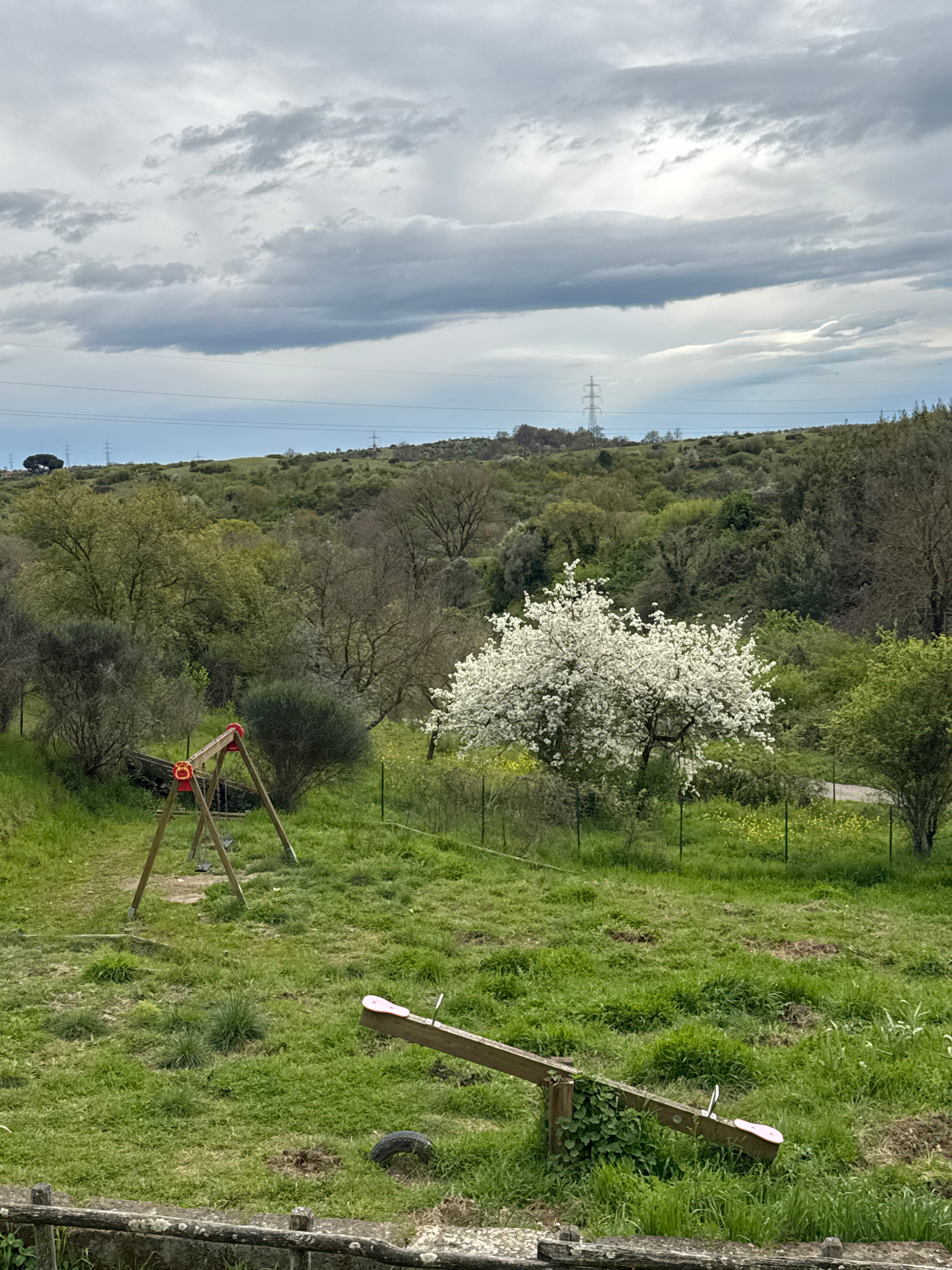 The image depicts an outdoor scene in Morlupo, Italy. The foreground features green grass, a seesaw, and a swing set. A white blooming tree stands in the middle ground, with a forested hillside beyondβ¦read more