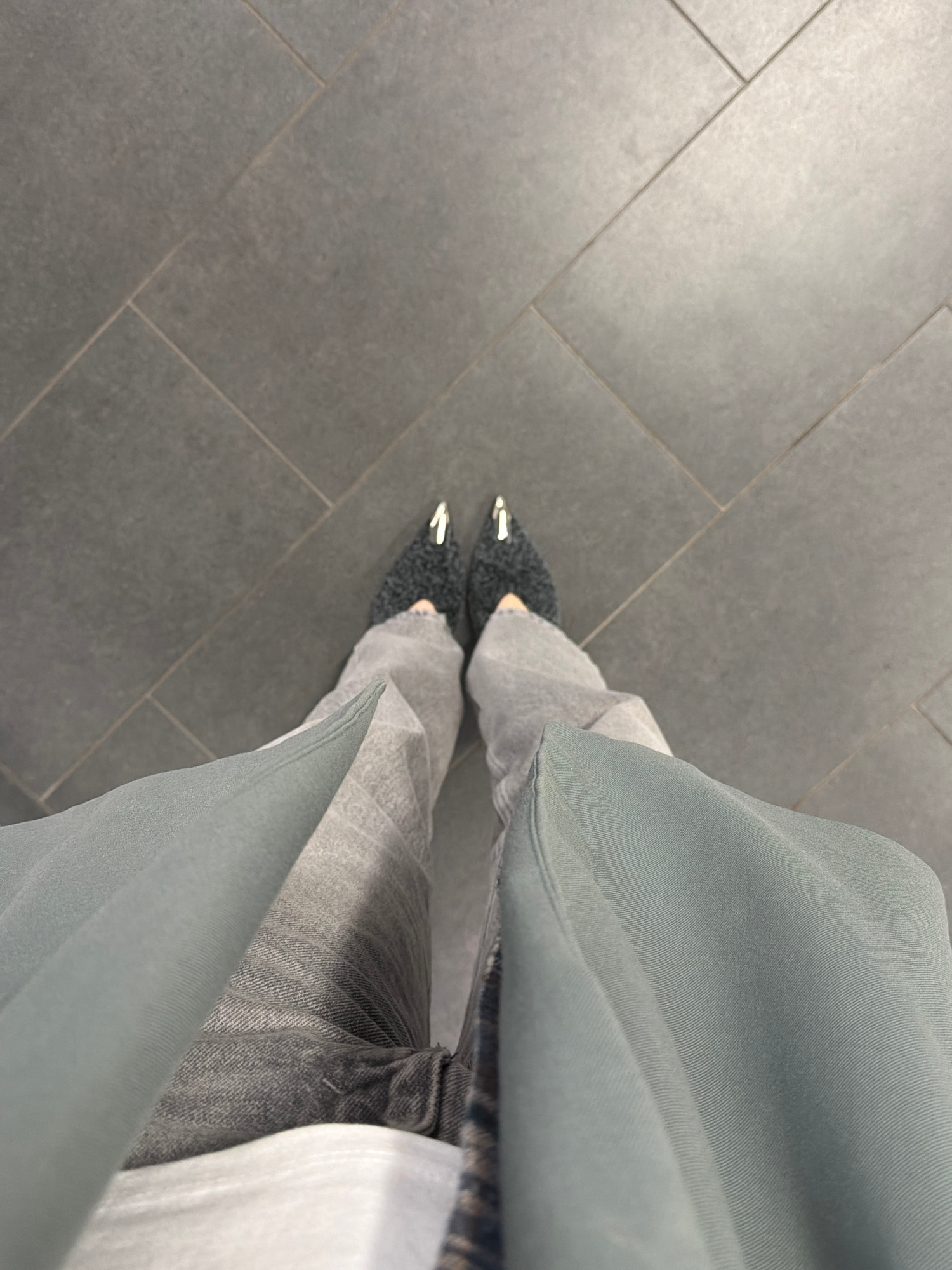 A first-person perspective photograph shows a person wearing gray jeans and shoes with pointed, metallic tips. The person is standing on a gray tiled floor. The lower half of a garment, possibly a coa…read more