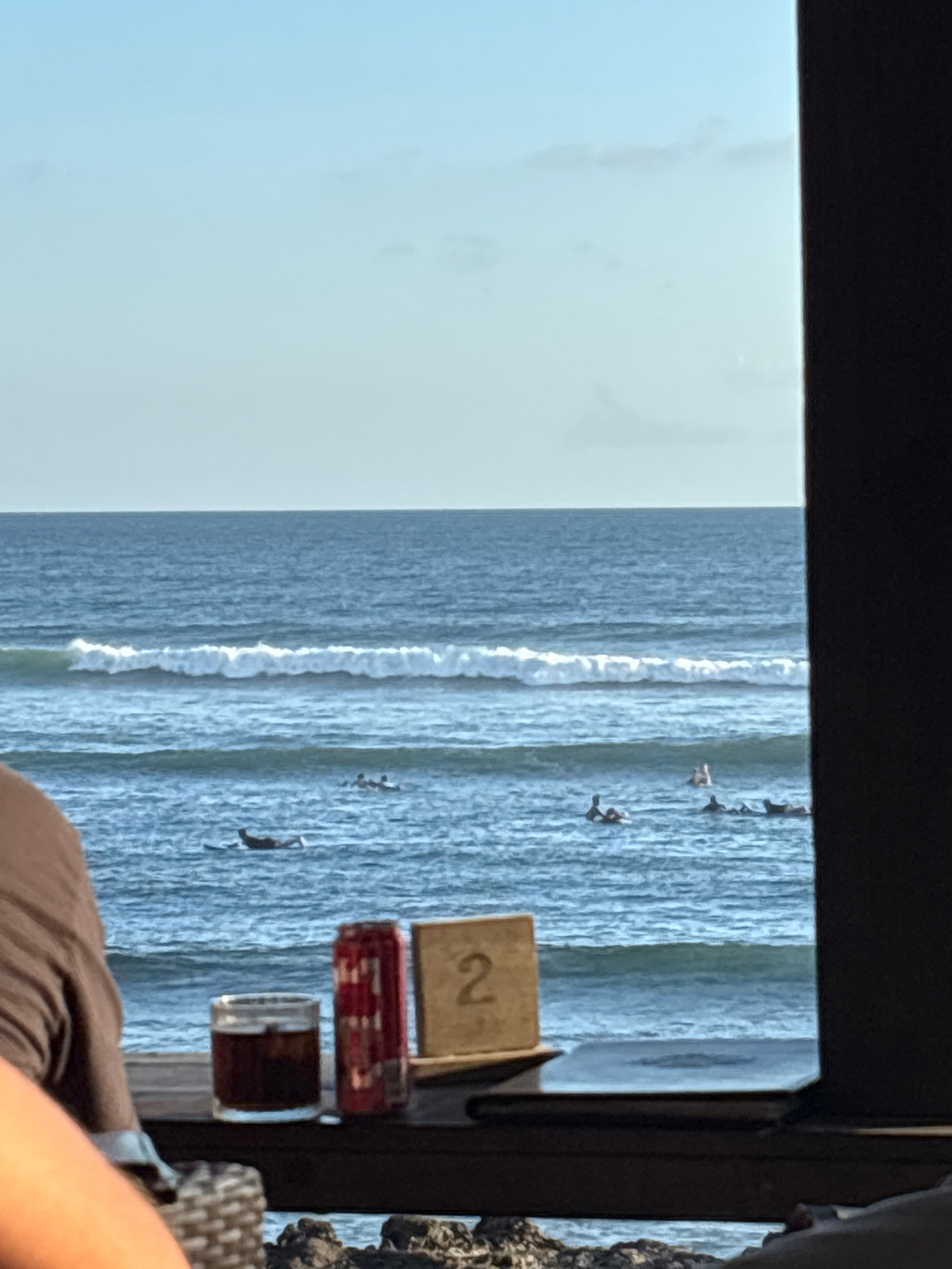 View from inside a building looking out toward the ocean, specifically in North Kuta, Indonesia. The scene is viewed through a dark frame, suggesting a window or doorway. The left side features a pale…read more