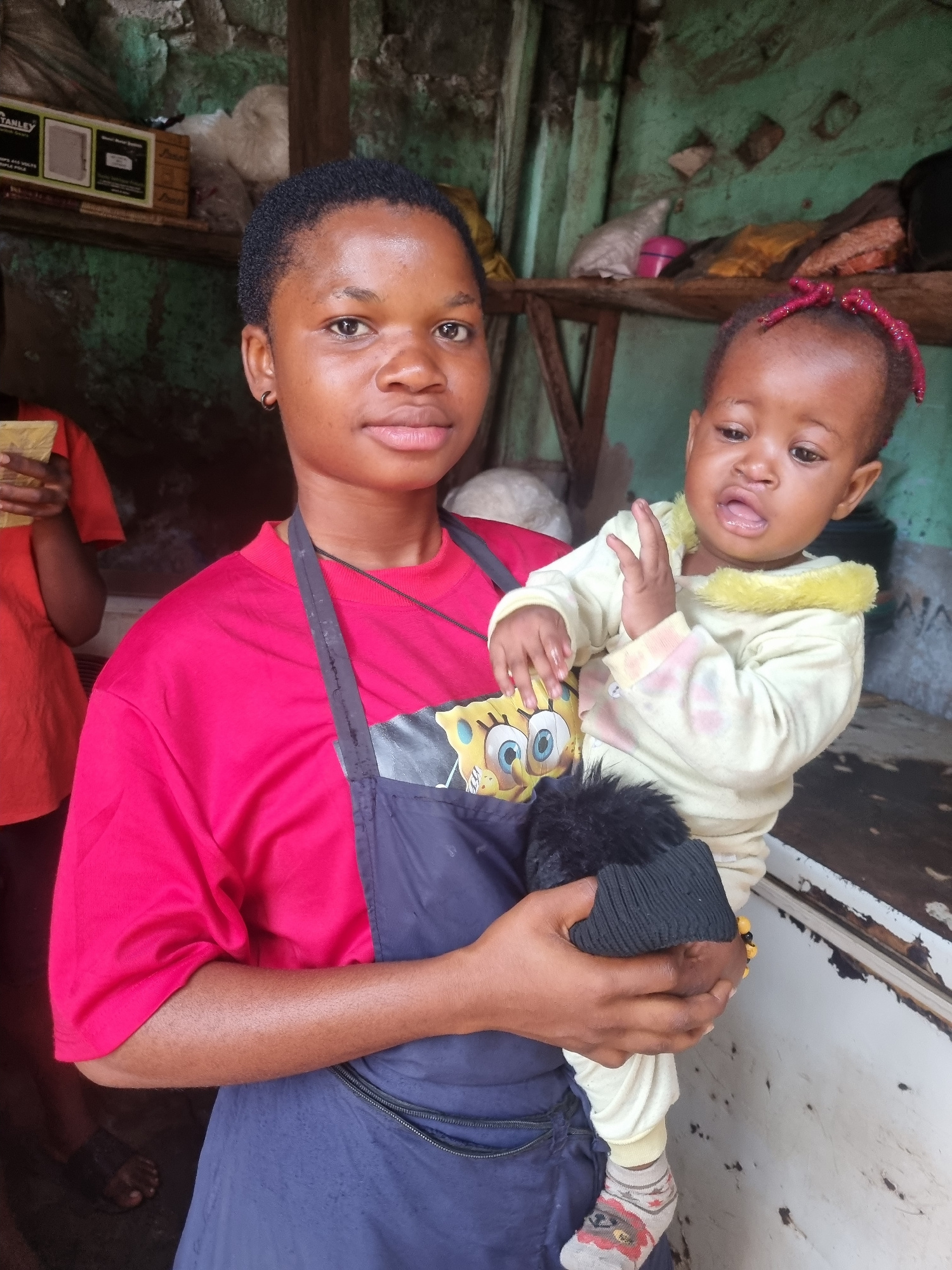 A portrait-oriented image captures a woman holding a baby on her hip or shoulder, both looking towards the camera. The woman, with short dark hair, wears a bright red short-sleeved t-shirt and a dark…read more