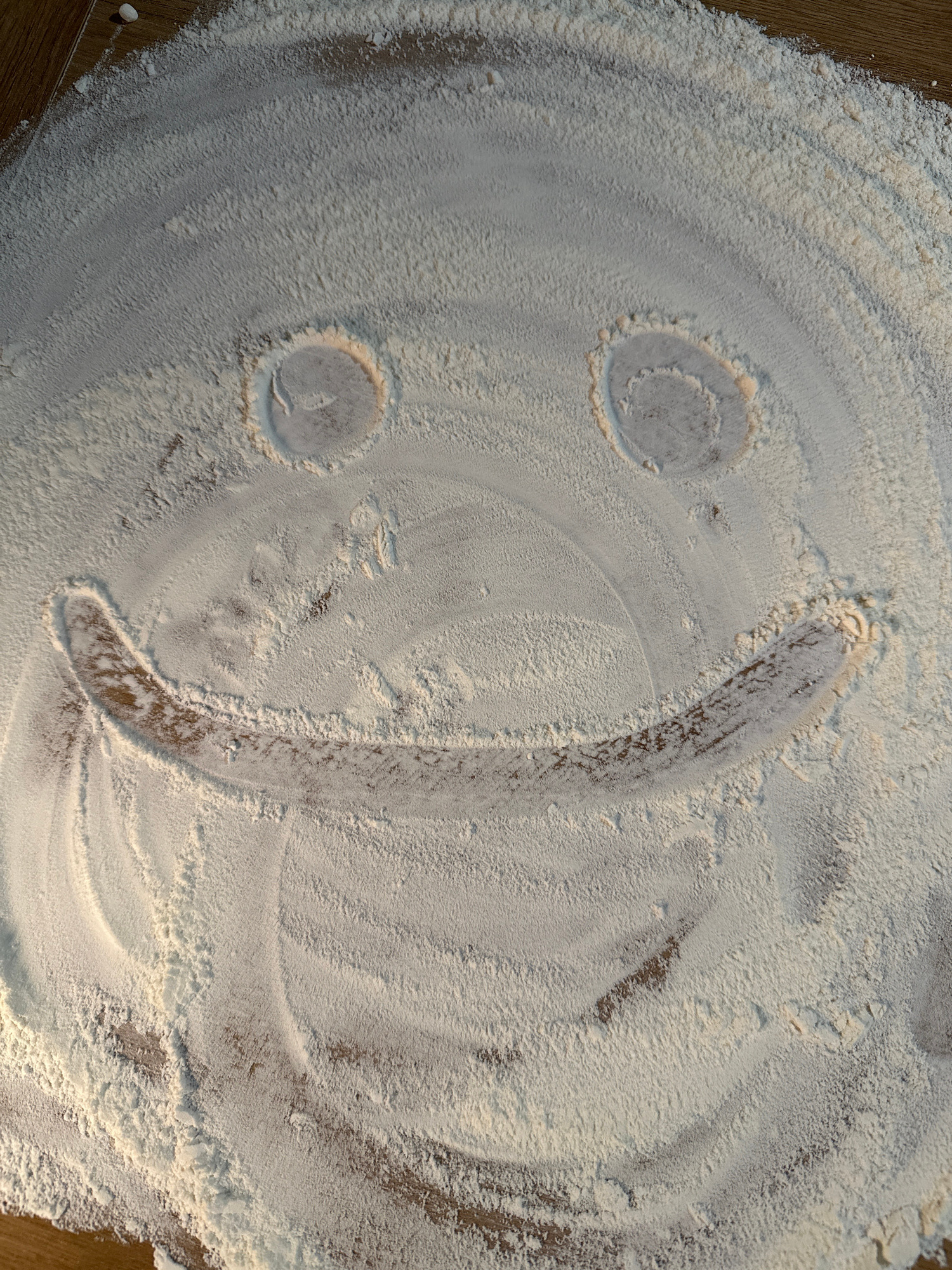 A close-up overhead shot depicts a surface covered in white flour, likely a countertop or table. The flour has been disturbed to create a simplistic smiling face. The eyes are formed by circular depre…read more
