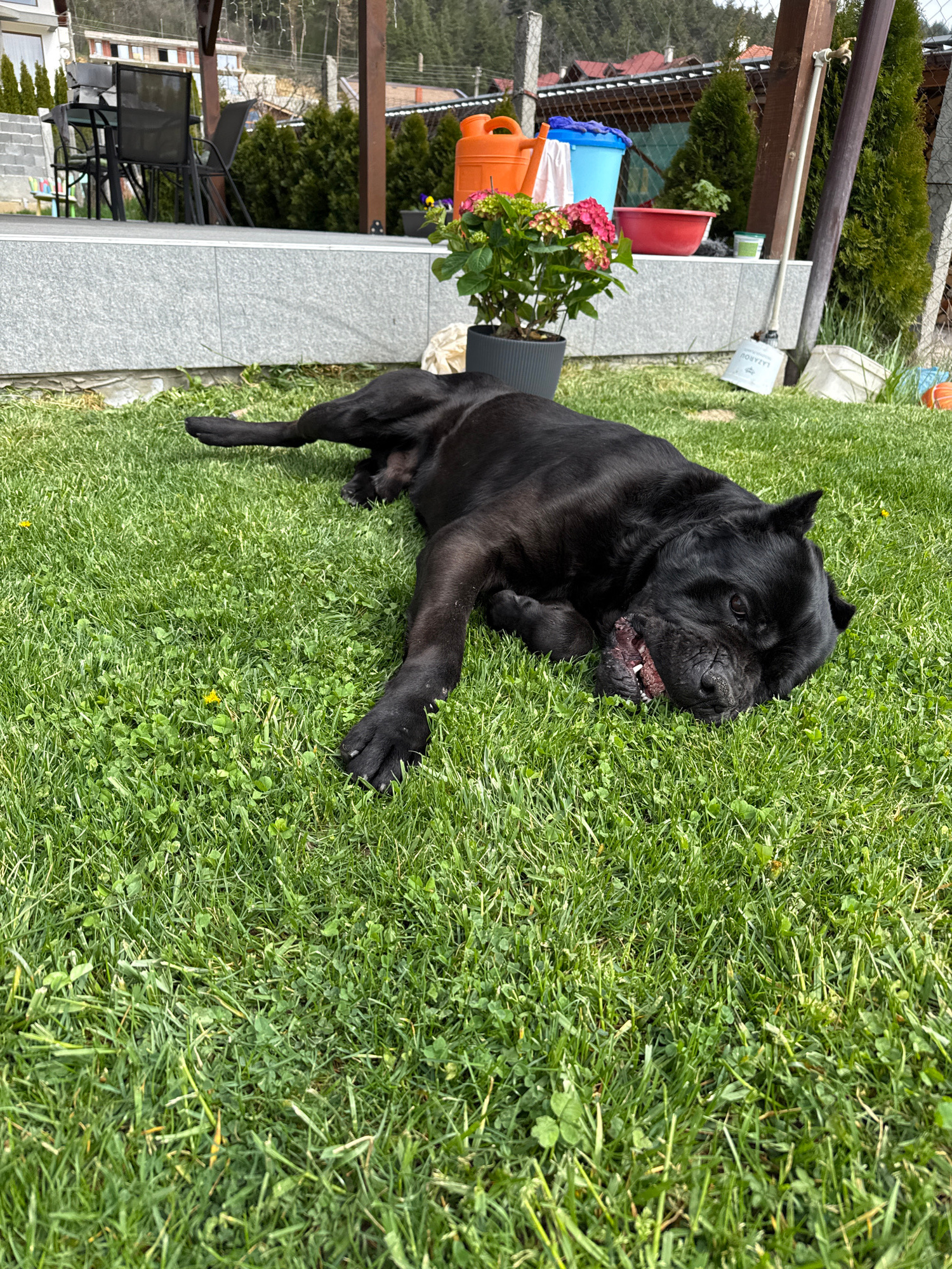 A large, muscular black dog, likely a Cane Corso with cropped ears, is the central subject, resting on its left side on a lush green lawn. The dog's head is turned slightly towards the viewer, its mou…read more