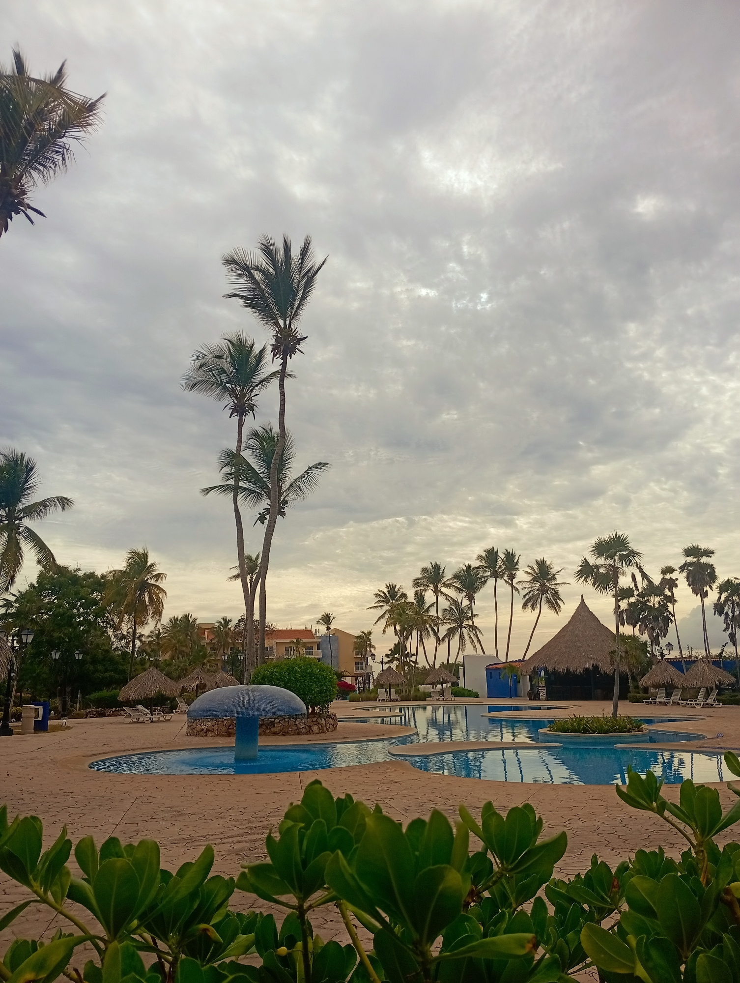 The image depicts a resort in Playa El Agua, Venezuela. In the foreground, green shrubbery obscures part of the scene. A network of connected swimming pools with light blue water lies beyond the shrub…read more