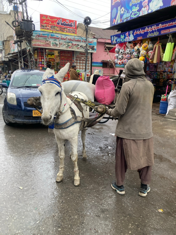 The image displays an urban street scene in Quetta City Tehsil, Pakistan, characterized by a wet asphalt surface under an overcast sky. Central to the foreground is a white donkey, facing slightly lef…read more