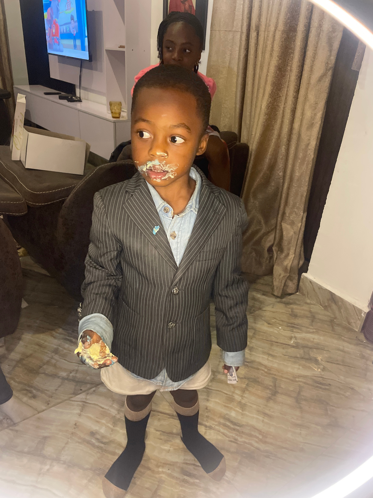 A young boy in a pinstripe suit sits on the floor, his face and hand smeared with cake. A woman stands behind him, partially visible. The boy is holding a small stack of money in his other hand. The eā¦read more