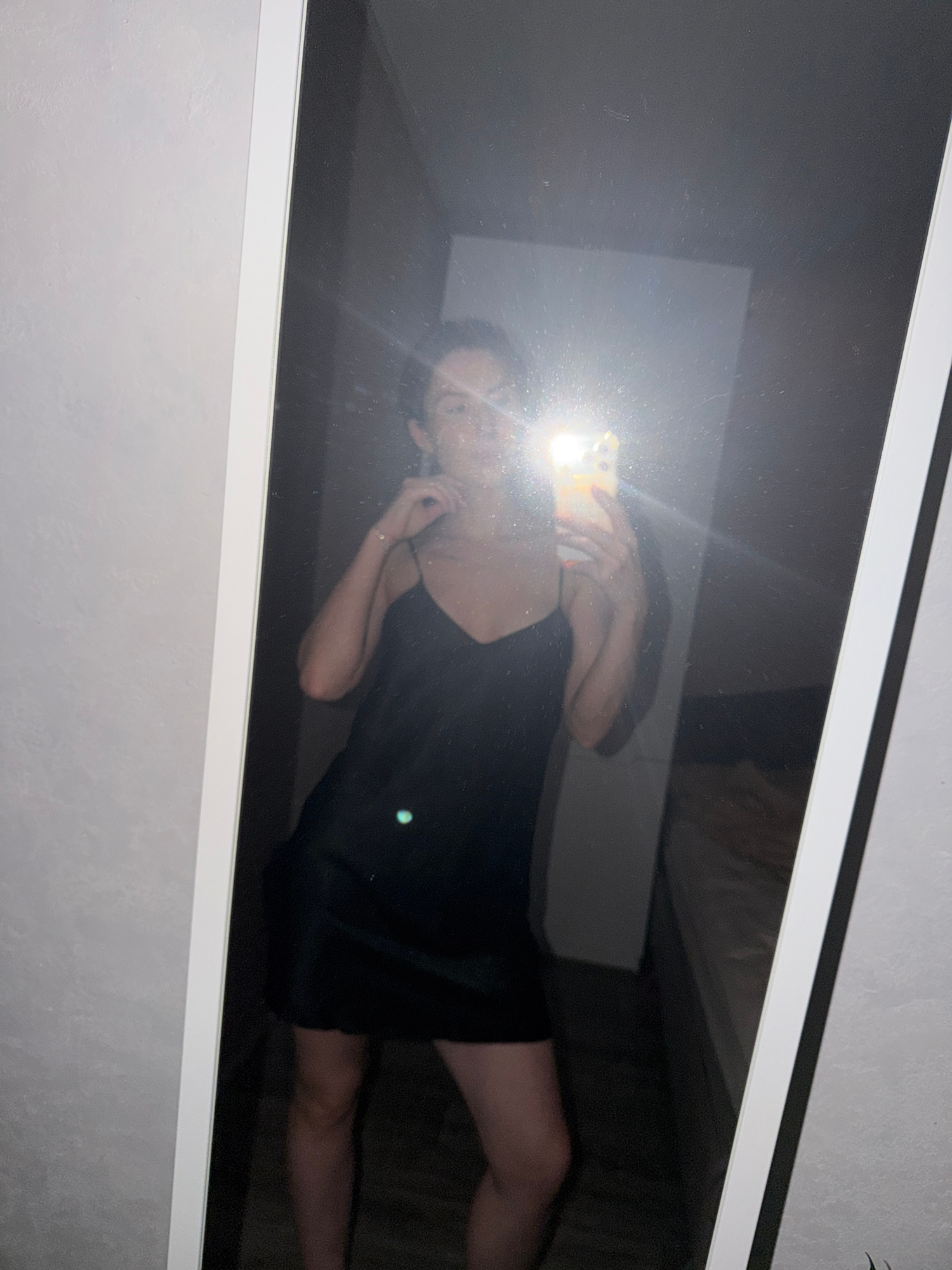 The image shows a reflection of a person in a mirror. The person is holding a phone and appears to be taking a selfie. The person is wearing a black dress. The background is blurry, but it appears to…read more