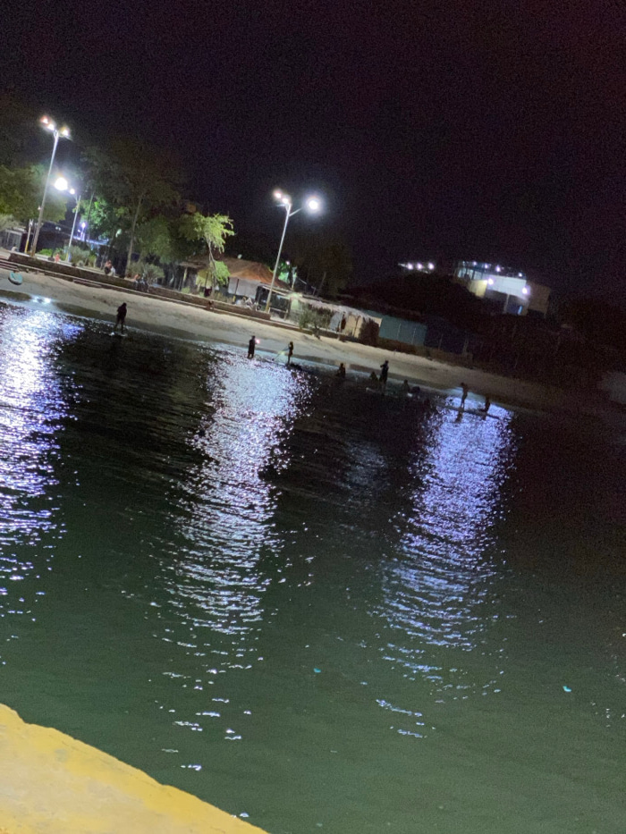 A nighttime view features a body of water, likely a river or lake, with reflections of lights creating shimmering patterns on the surface. A paved path runs along the water's edge, illuminated by stre…read more