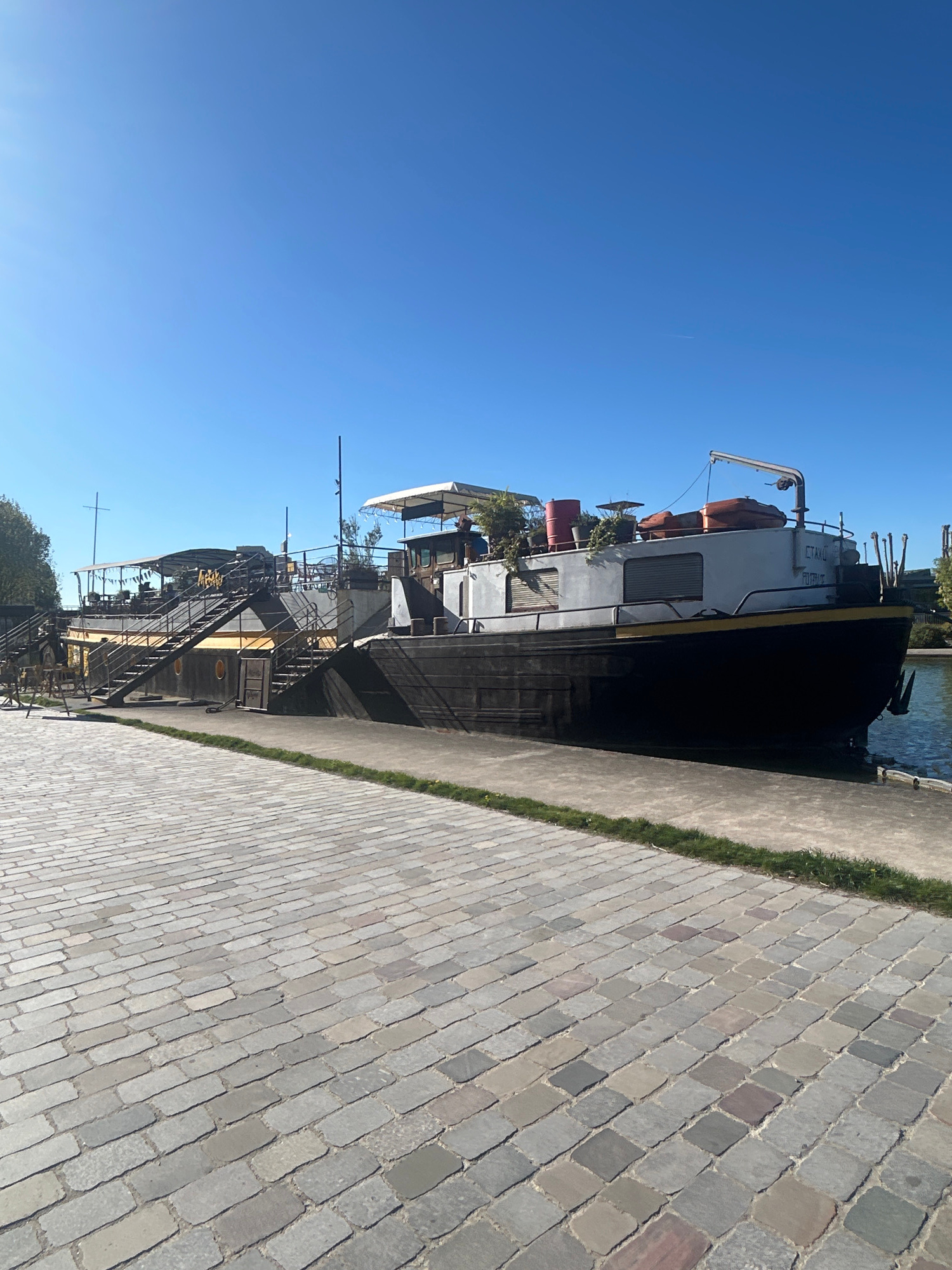 The image depicts a large, docked ship alongside a cobblestone walkway. The ship is multi-tiered and appears to be a historical vessel with visible decks, stairs, and various fixtures. There are plant…read more