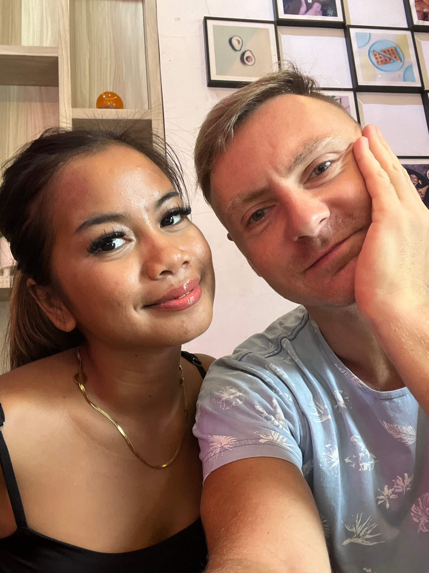 A selfie of a Caucasian man and an Indonesian woman in Sukawati, Indonesia. The man, fair-skinned with short blonde hair, is positioned slightly above the woman. He is wearing a light blue shirt with…read more