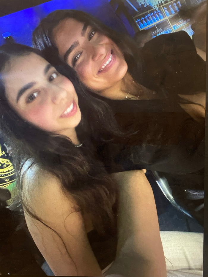 Two smiling women pose closely together, their faces tilted. The woman on the left wears a dark top with a necklace. To her right, another woman with long, dark hair and a necklace smiles, her shoulde…read more