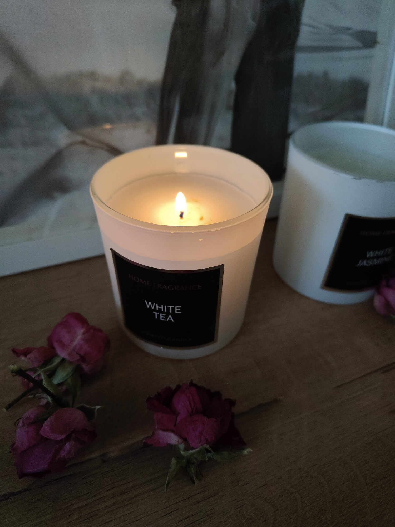 The image shows two candles on a wooden surface, with dried rose petals scattered around them. The candle in the foreground is white with a black label that reads "HOME FRAGRANCE" above "WHITE TEA". I…read more