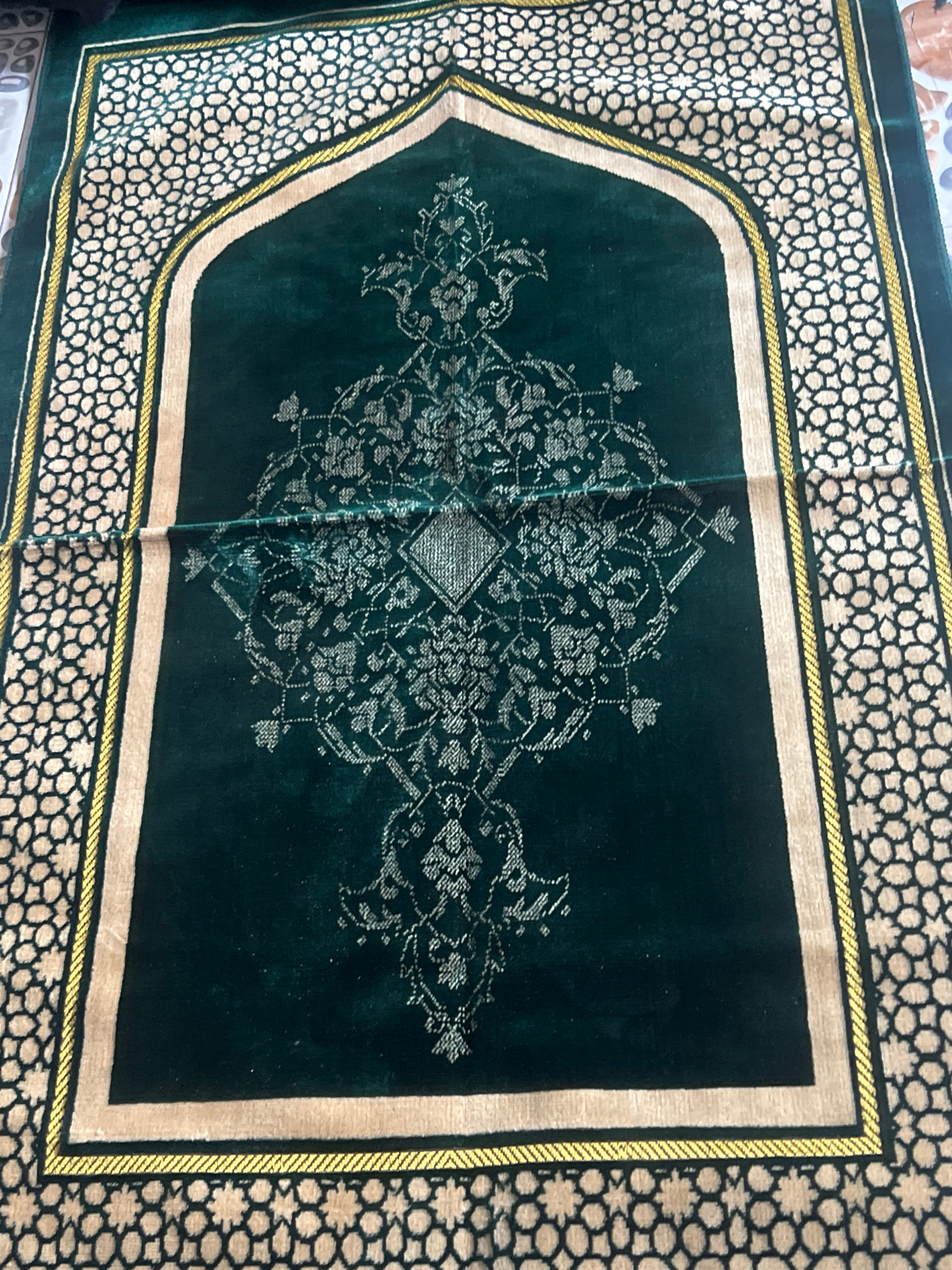 The image shows a dark green prayer rug with an ornate, symmetrical silver-colored design at its center. The rug has a tan border outlined with gold, and a patterned outer edge of repeating black and…read more