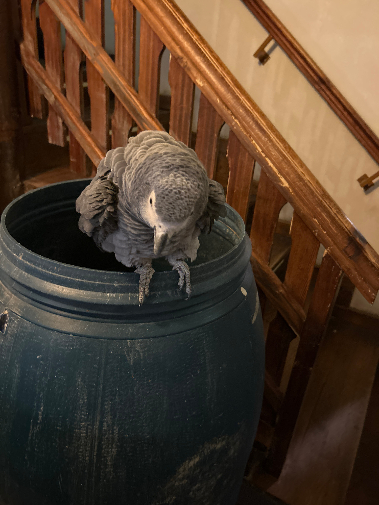 The image presents a top-down view of a grey parrot perched on the rim of a large, dark blue or black cylindrical barrel. The parrot, likely an African Grey, is the central subject, its grey feathers…read more
