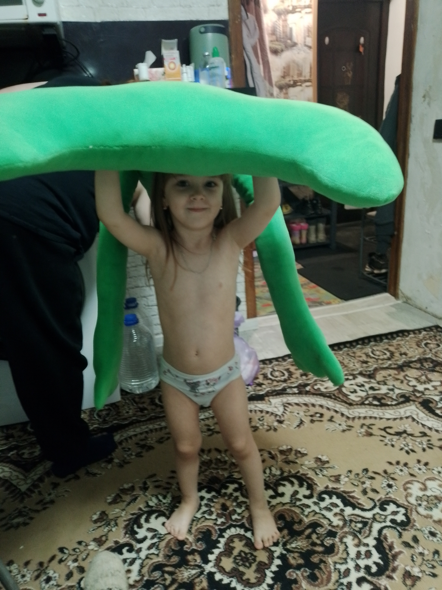 A young child stands in a room holding a large green, plush object above their head. The child is wearing underwear. To the left of the child is a person wearing black clothing. In the background are…read more