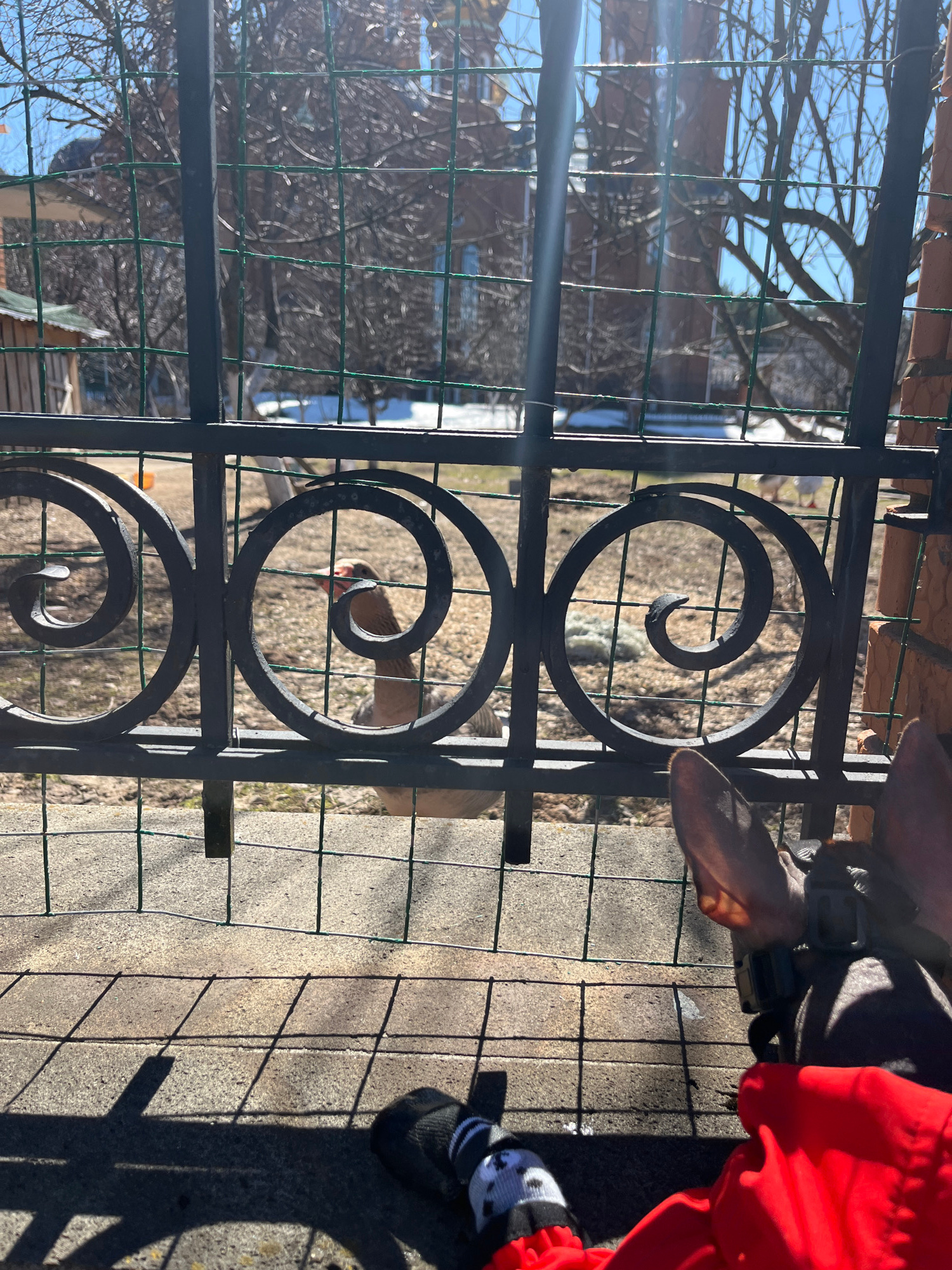 A partially obscured waterfowl, likely a duck or goose, is visible through an ornate, black metal fence. The bird has a brown and white patterned body with a reddish beak. The fence has circular, spir…read more