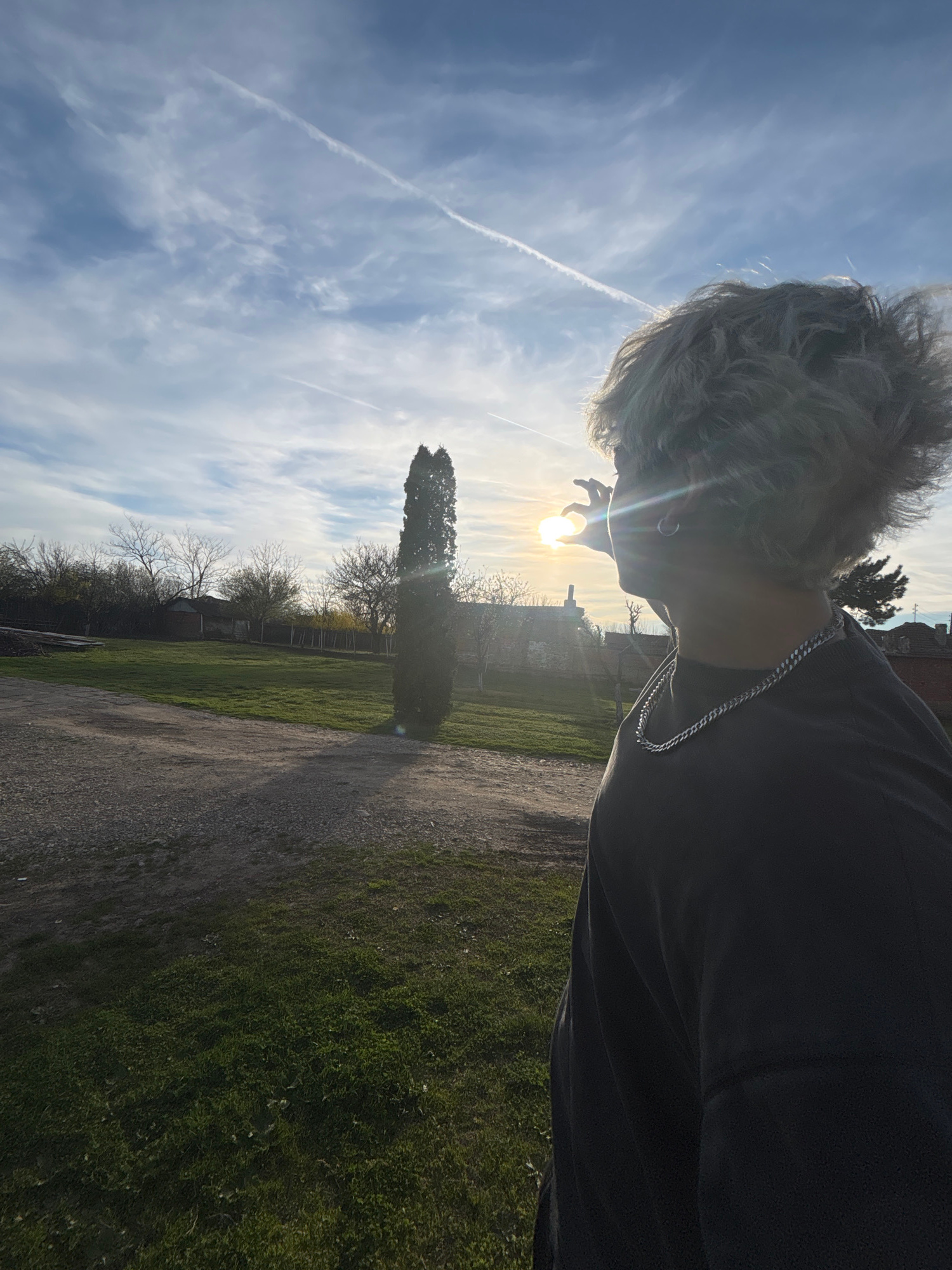 The image depicts a person with short, wavy blond hair standing outdoors, facing the sun. The person is wearing a dark-colored shirt and a silver chain. Their hand is raised, partially obscuring the s…read more