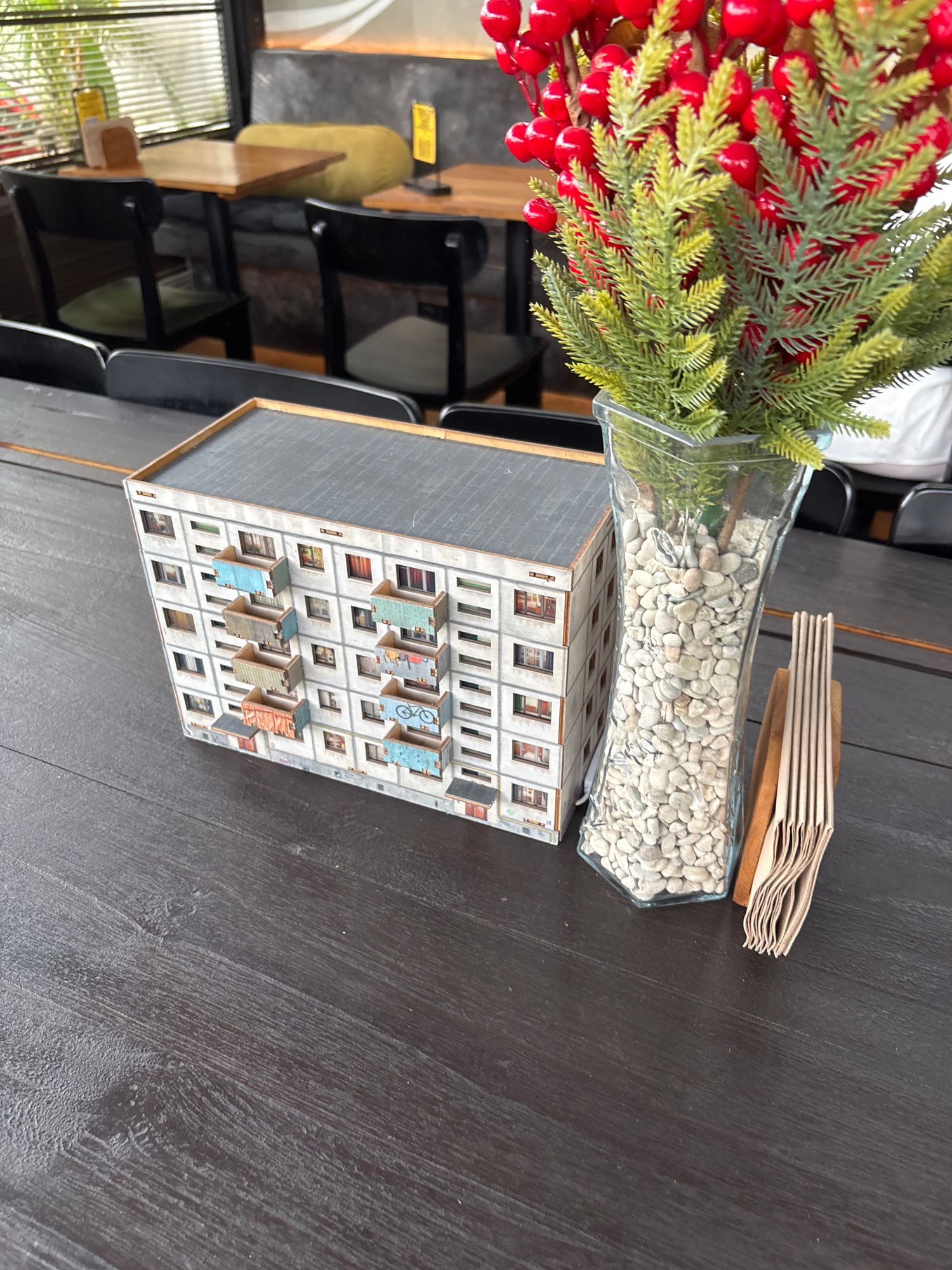 The image captures a still life arrangement on a dark, wood-grained table, likely within an indoor setting such as a cafe or restaurant. The prominent subjects include a clear glass vase, a miniature…read more