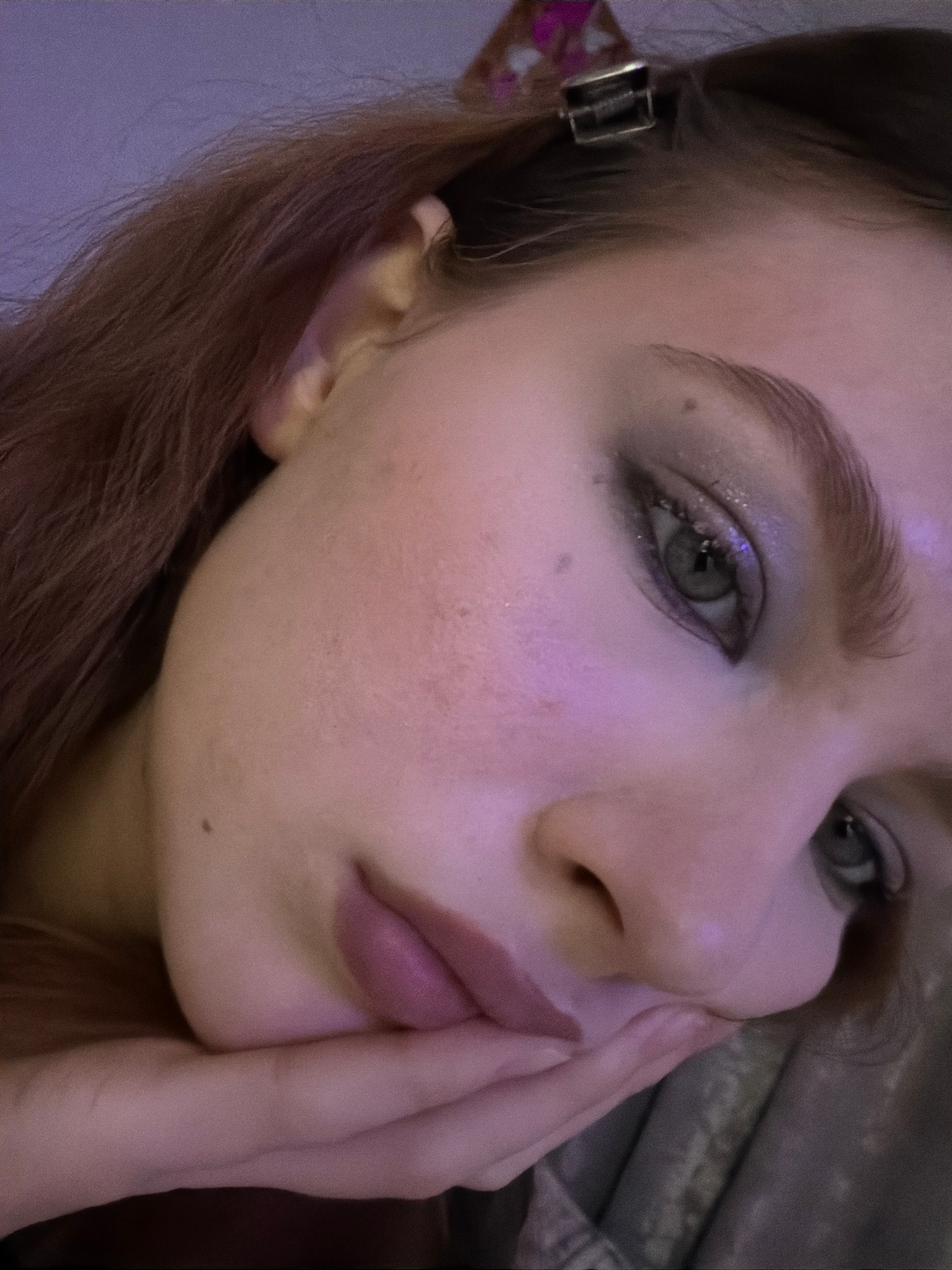 A close-up, low-angle view shows a young woman with fair skin and light brown hair. She is looking slightly downward and to the right. Her left hand is raised to her face, with fingers partially obscu…read more