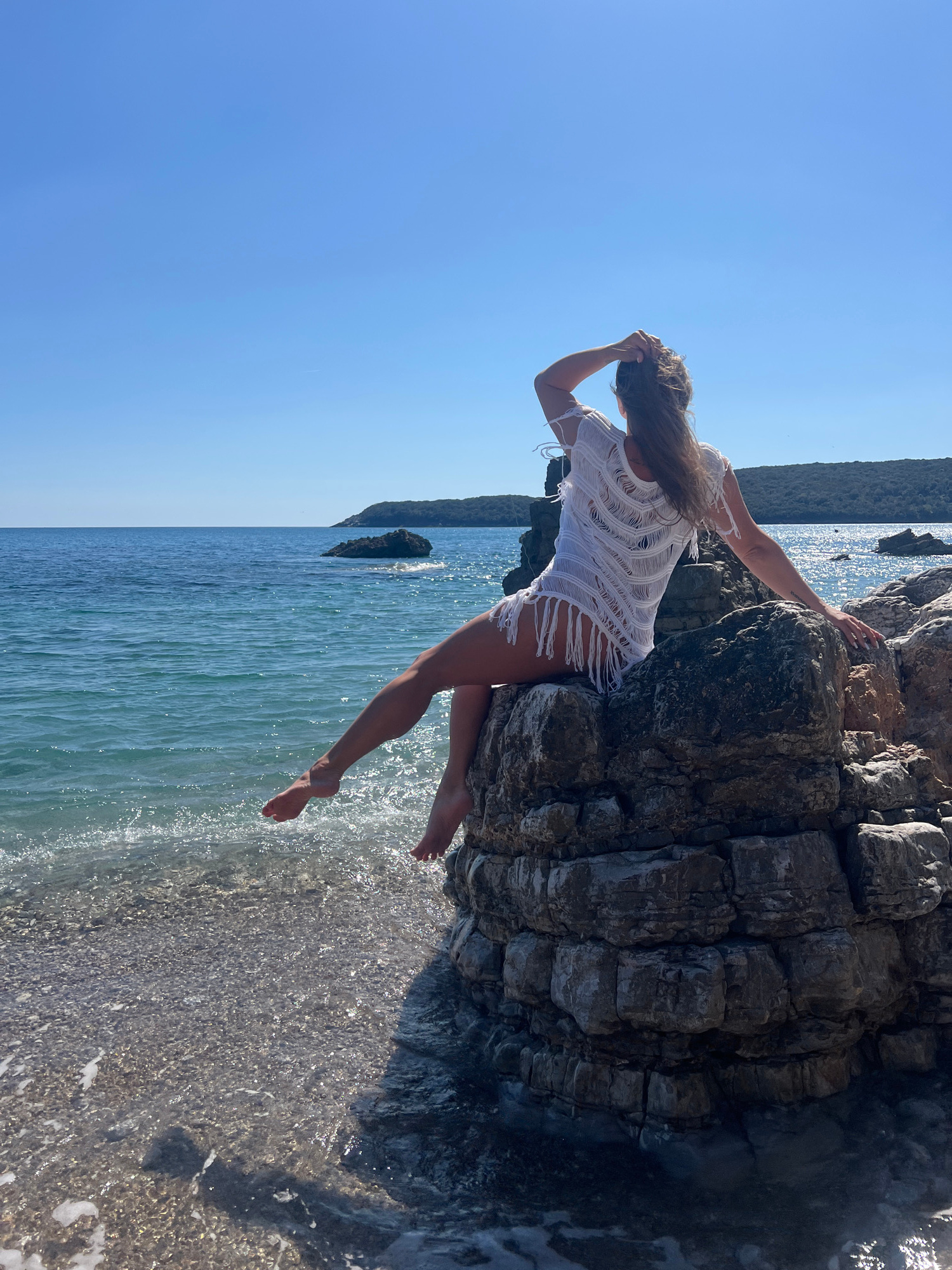 A woman in a white, fringed cover-up is perched on a rocky outcrop at a beach in Prijevor, Montenegro. She is touching her hair with her right hand, and her left arm is extended to the side. Her legs…read more