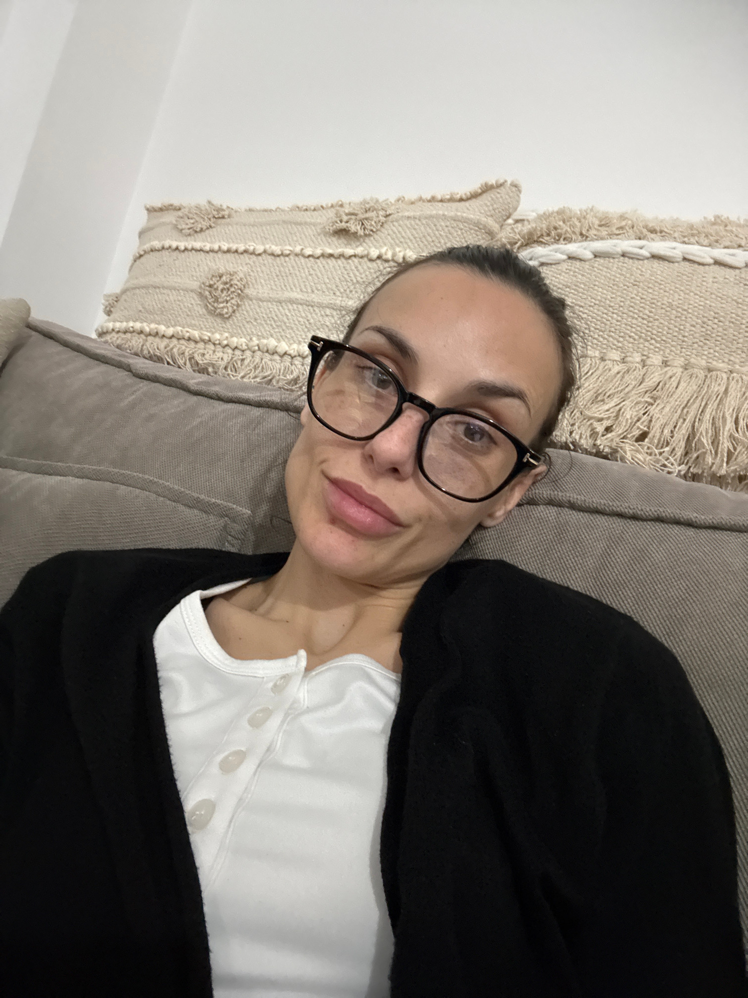The image is a selfie of a light-skinned woman with her hair pulled back, wearing black-rimmed glasses, a white buttoned shirt, and a black cardigan. She is lying on a gray couch next to a textured de…read more