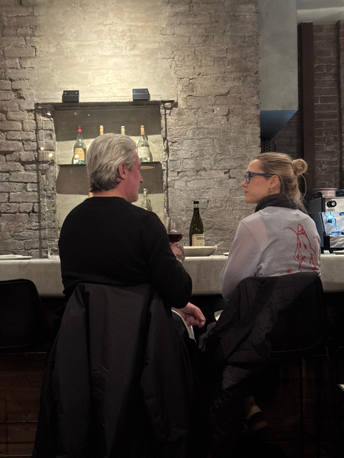Two individuals are seated at a counter within a dimly lit restaurant or bar in New York, United States of America. The background features an exposed light-colored brick wall with a recessed shelf di…read more
