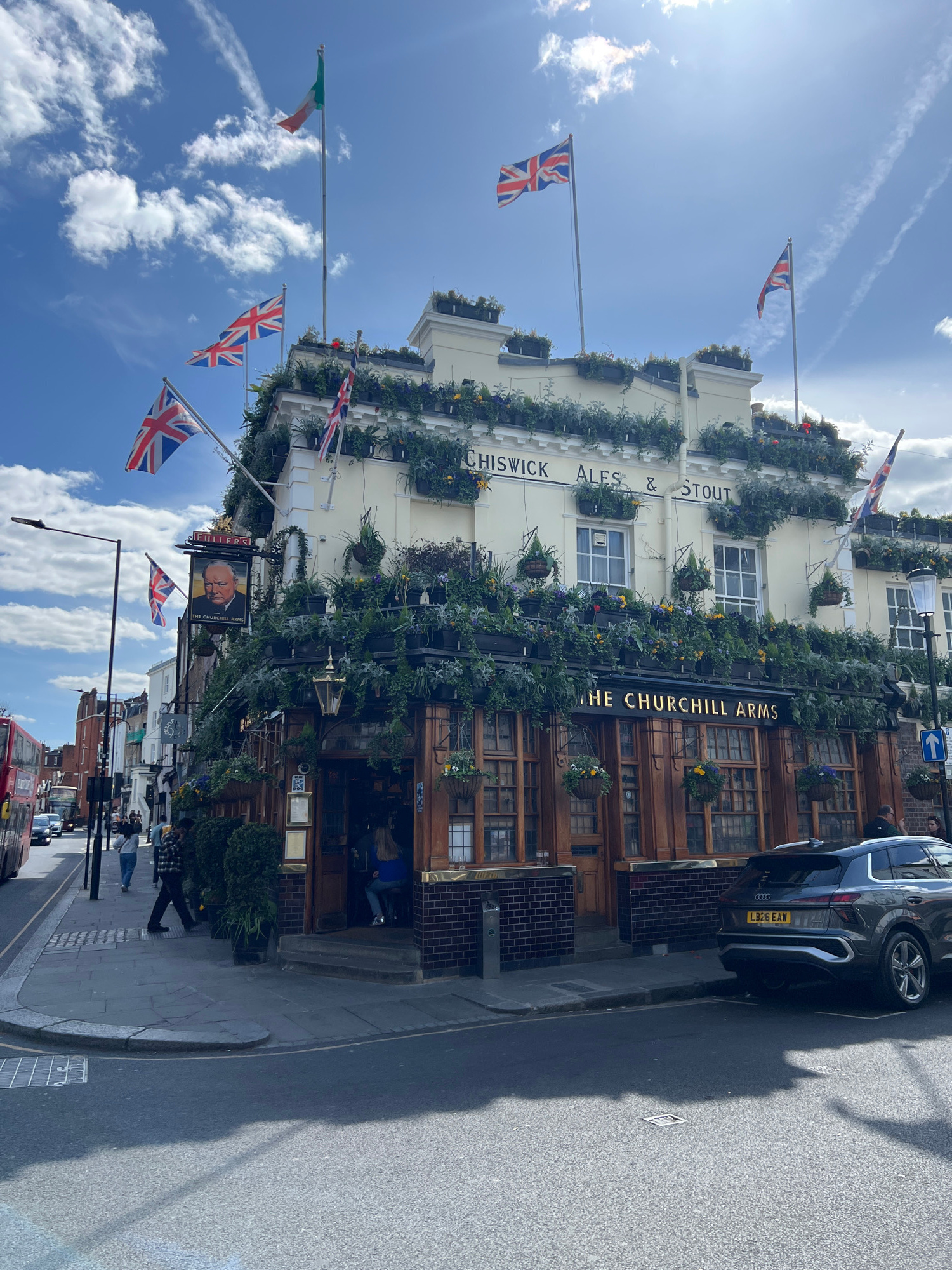 The image shows the exterior of "The Churchill Arms" pub in London, United Kingdom. The pub's facade is adorned with numerous flower boxes and hanging plants. The name "The Churchill Arms" is prominen…read more