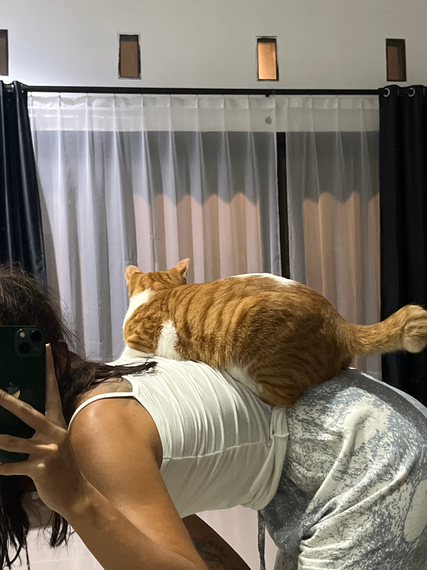 An indoor, sideways-oriented photograph captures a person taking a picture of an orange and white tabby cat resting on their torso. The cat, with prominent orange stripes and white fur on its belly an…read more