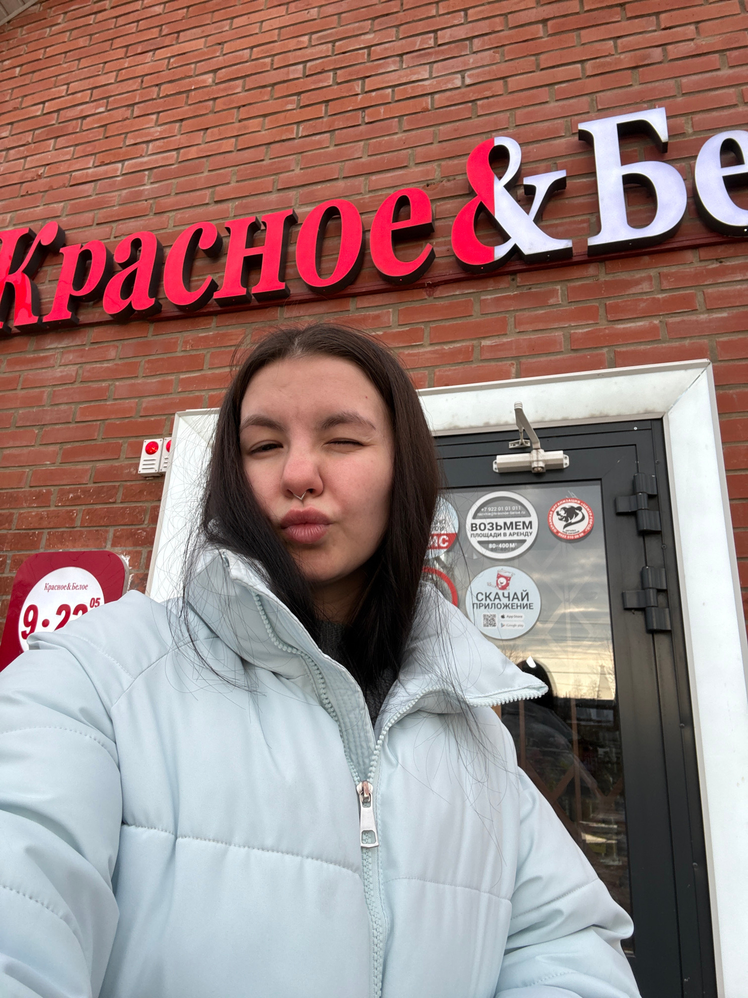 Here's a description of the image: The image shows a young woman in front of a "Krasnoe & Beloe" store ("Красное & Белое"), a Russian retail chain specializing in alcohol and tobacco products. The wo…read more
