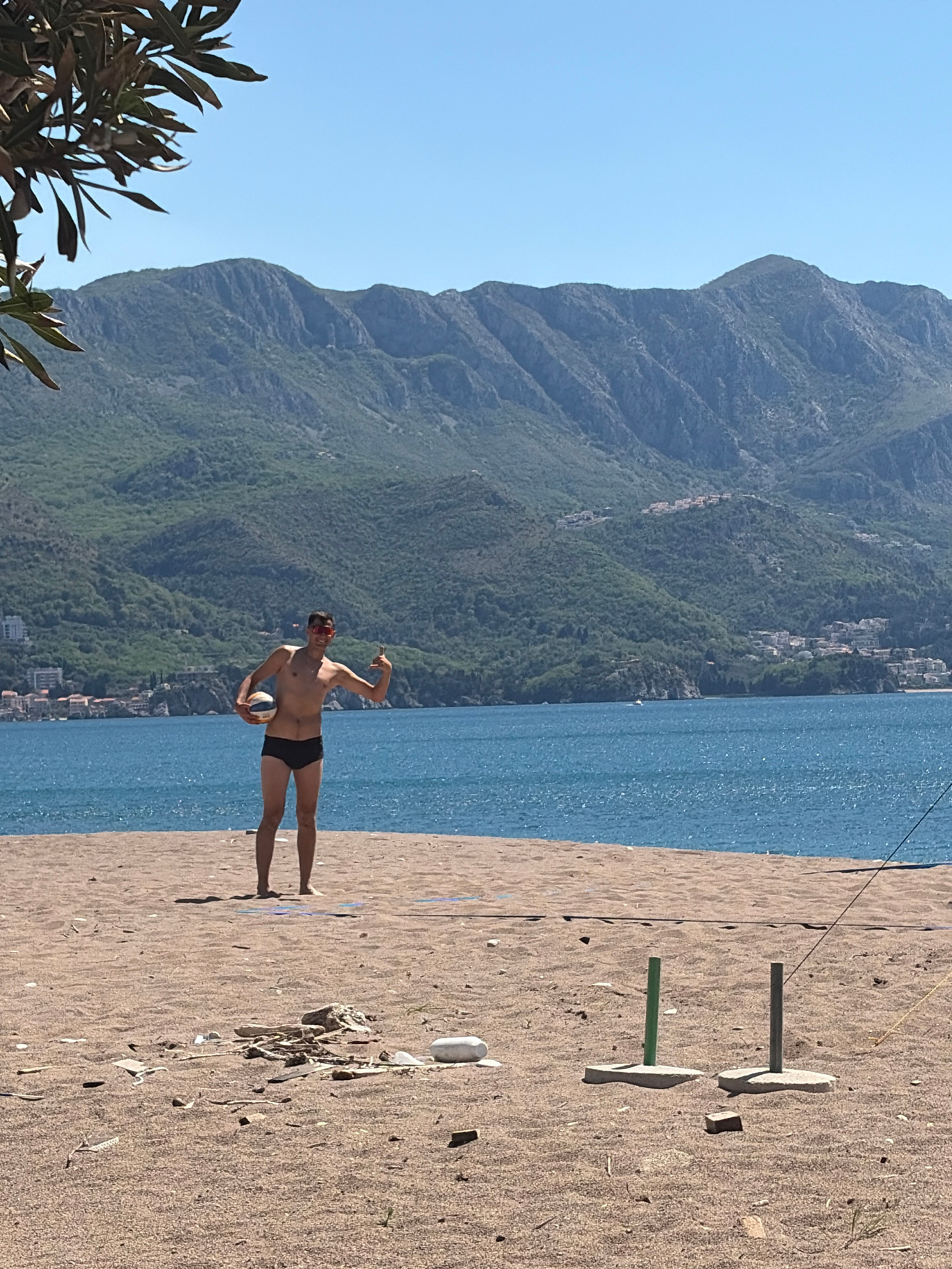 The image shows a man holding a volleyball on a beach. The man is wearing sunglasses and black shorts. A beach volleyball net is visible behind him. The sea is in the background, with mountains and bu…read more